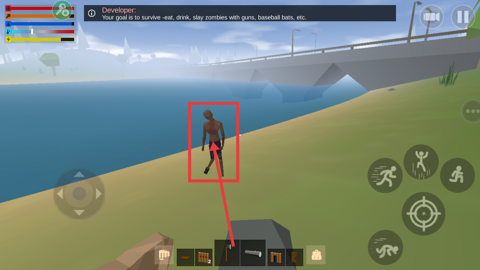 4、遇到河岸【僵尸】,遵循目标【survive-eat-drink-slay-zombies】,切换武器攻击自保。