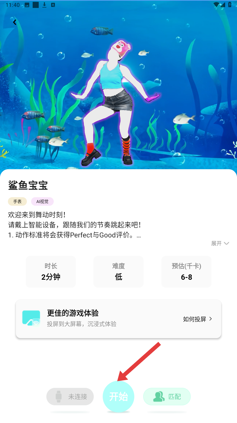 3、在【鲨鱼宝宝】详情页,确认难度/时长后点【开始】,戴设备跟跳即可。
