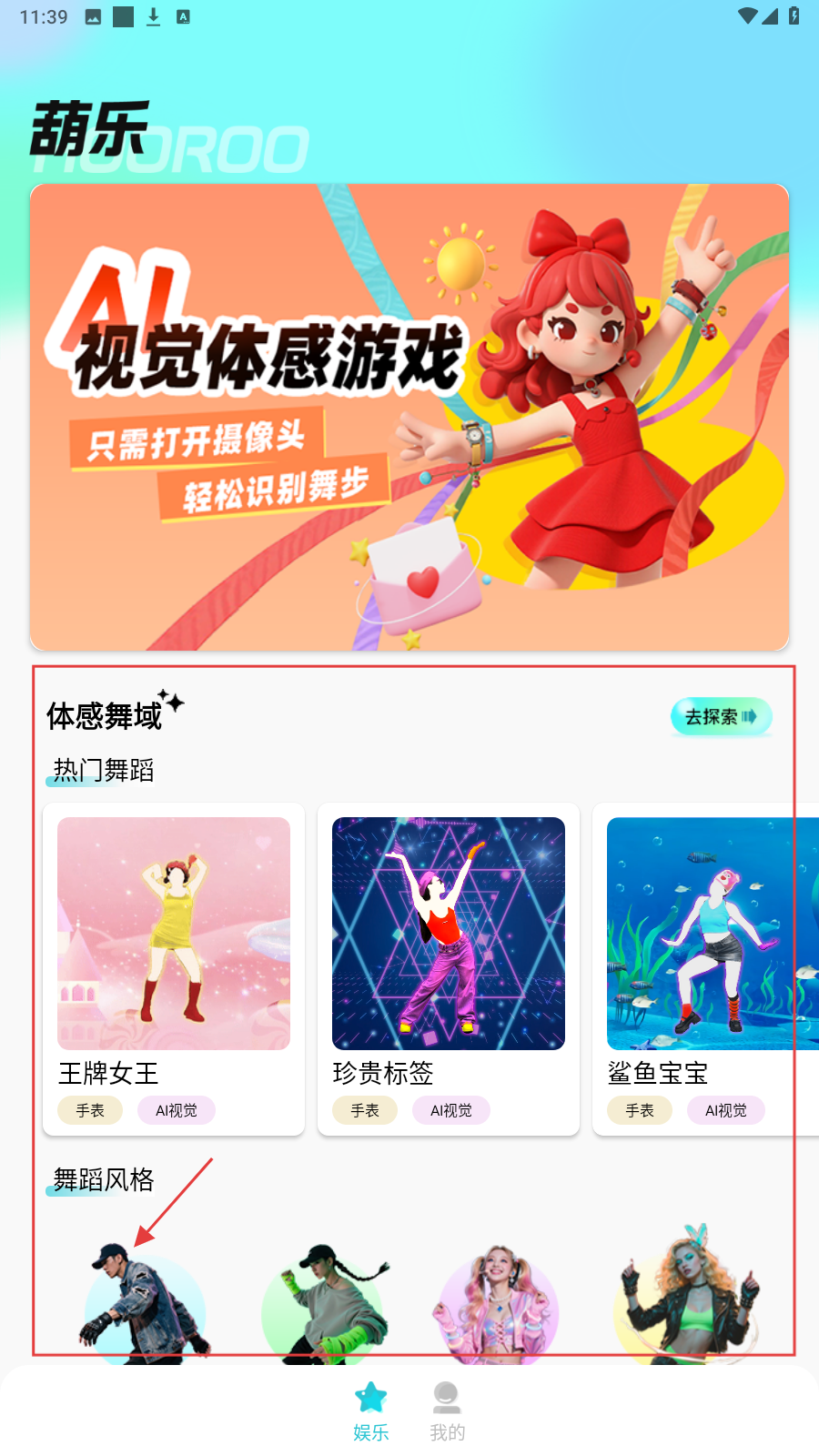 1、打开【葫乐】找【体感舞域】,选【热门舞蹈】或【舞蹈风格】开启AI视觉体感舞蹈。