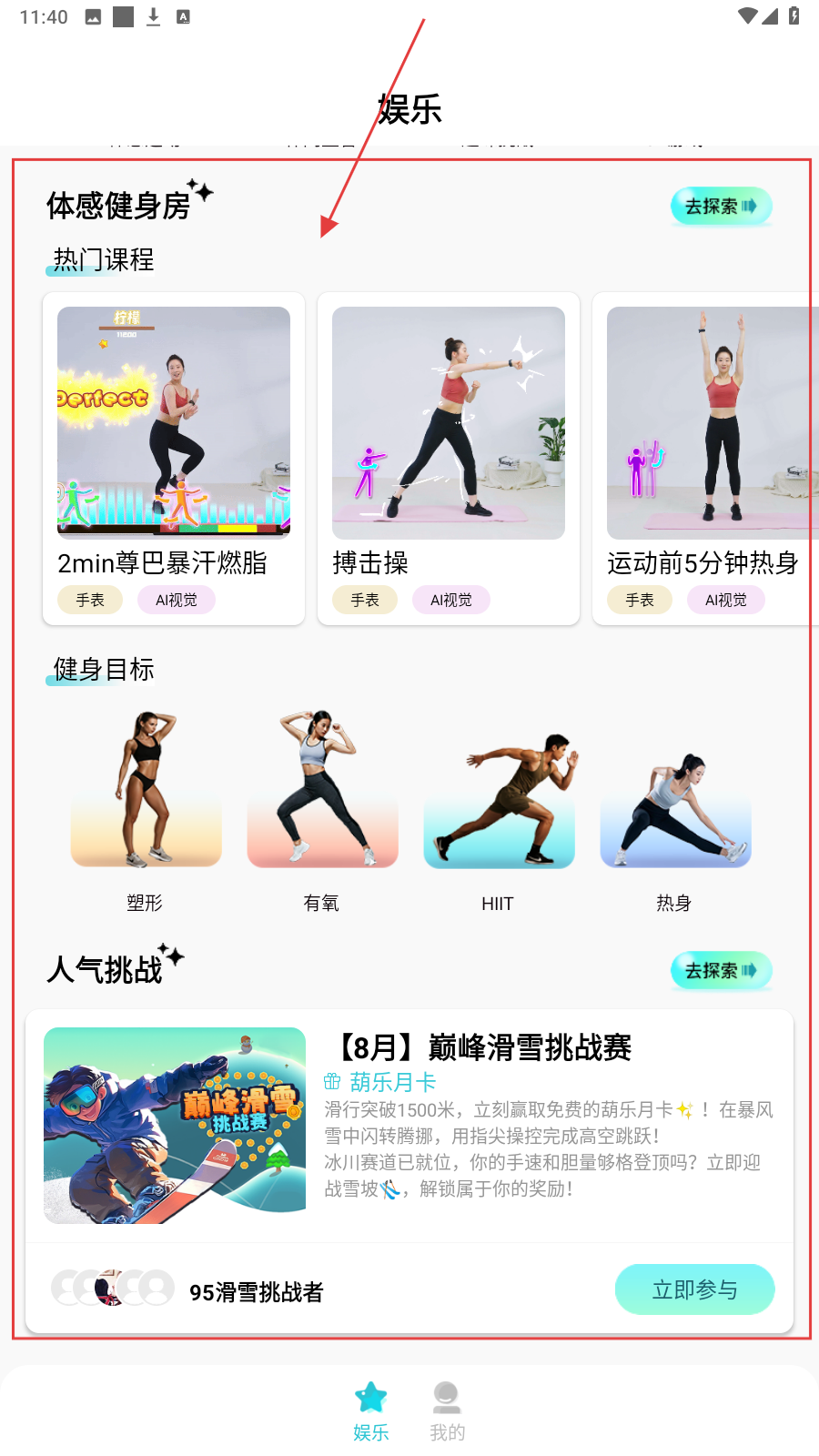 4、还可以在首页查看【体感健身房】栏目,查看【热门课程】(如2min尊巴)或按【健身目标】挑内容。