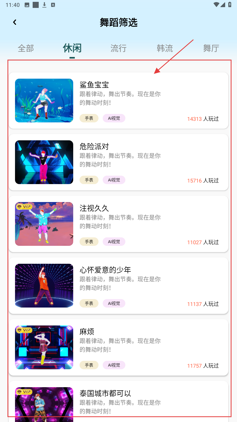 2、舞蹈筛选页选分类(休闲/流行等),挑喜欢的舞蹈(如鲨鱼宝宝)进入详情。