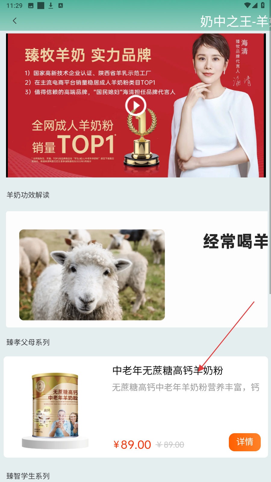 4、进入羊奶详情页,查看【中老年无蔗糖高钙羊奶粉】商品信息,按需选购。