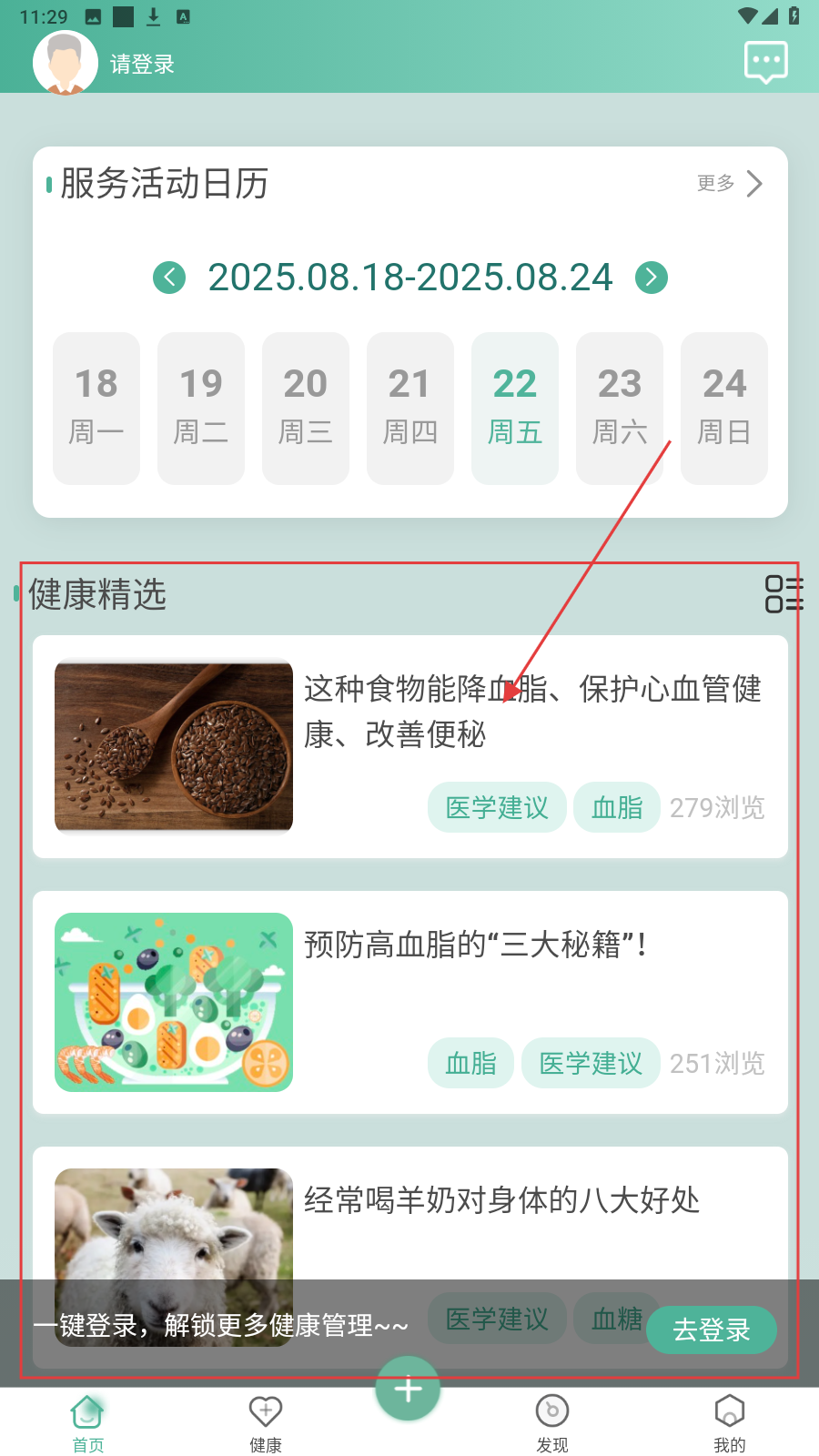 1、首页看【服务活动日历】,选日期了解健康活动,点【健康精选】文章学知识。