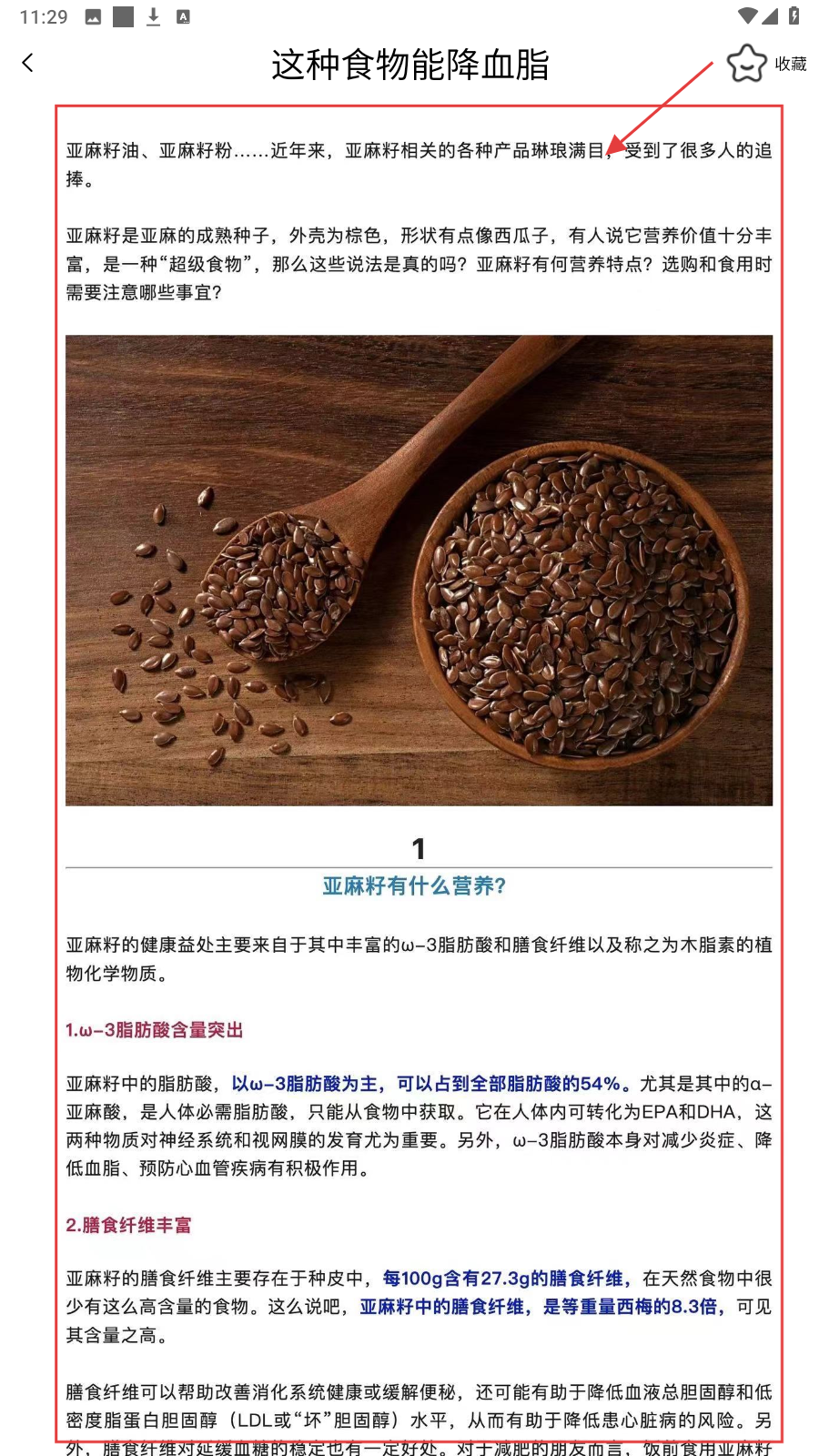 2、打开健康文章,如【这种食物能降血脂】,阅读亚麻籽营养等内容做健康参考。