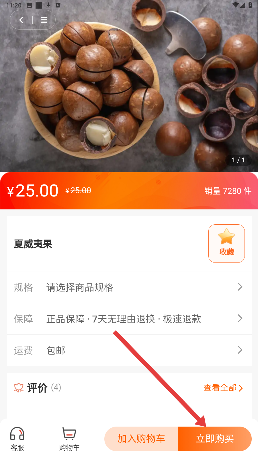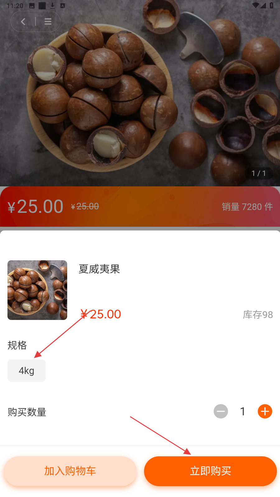 2、商品详情页选【夏威夷果】,点【立即购买】进入下单流程。