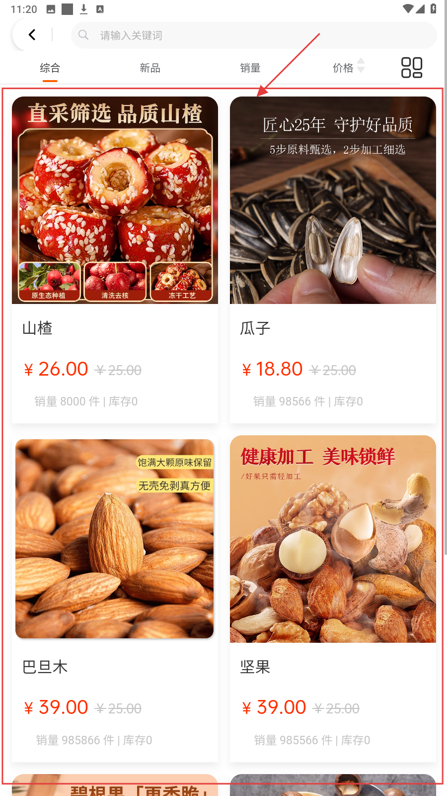 1、进入购物页,选【山楂-瓜子-巴旦木-坚果】等商品分类,浏览找心仪零食。