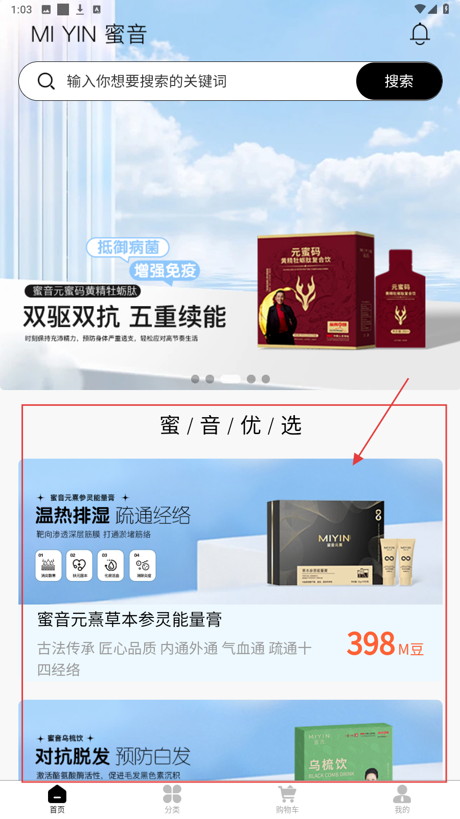 1、进入软件首页,选【蜜音优选】商品,如能量膏,查看详情。