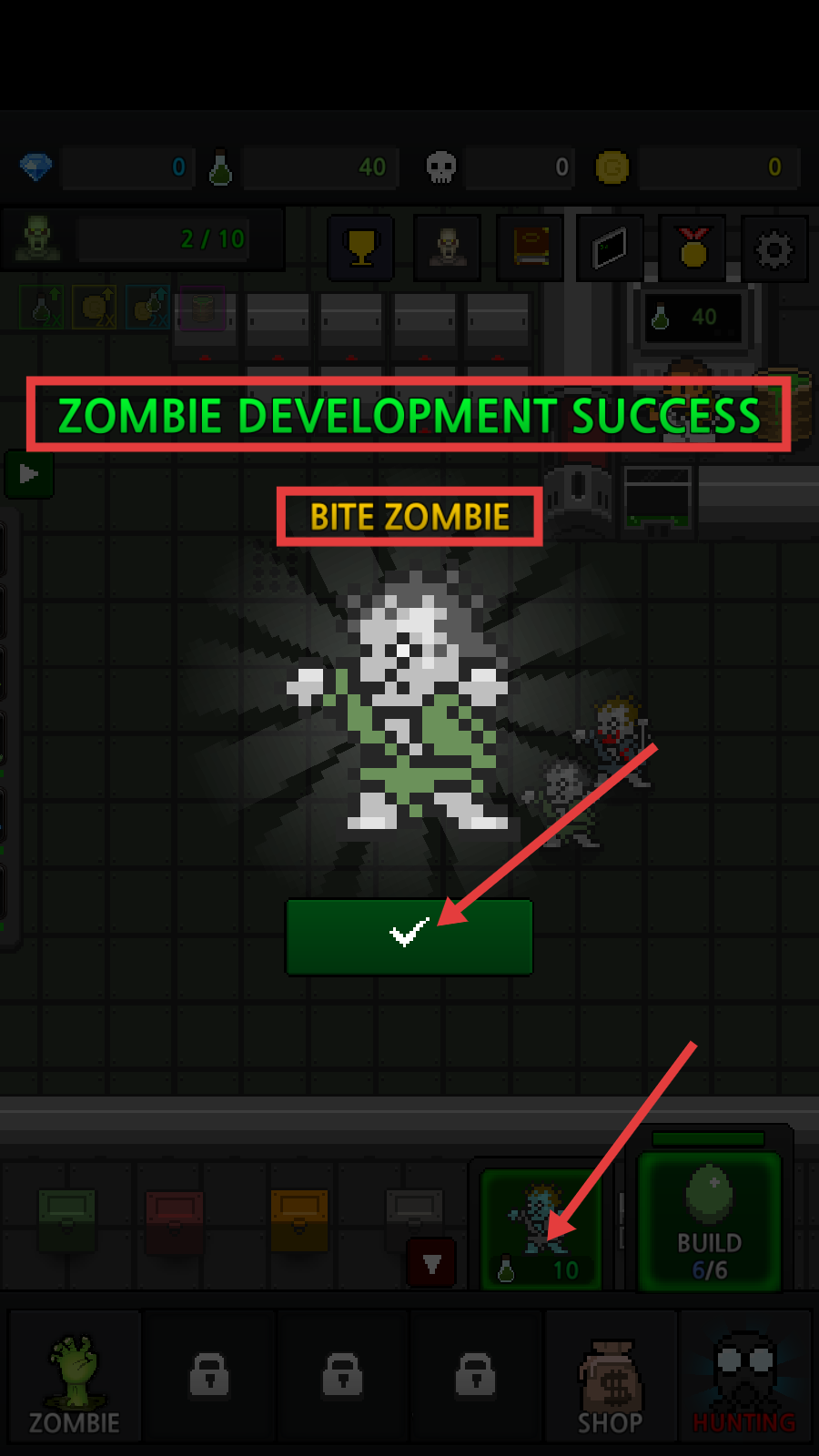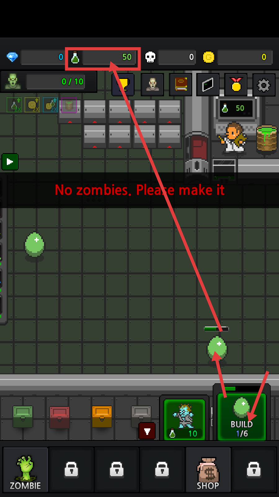 1、消耗【试剂-50】点击【BUILD】制作僵尸,积累数量解锁更多培育玩法,推进前期进程。