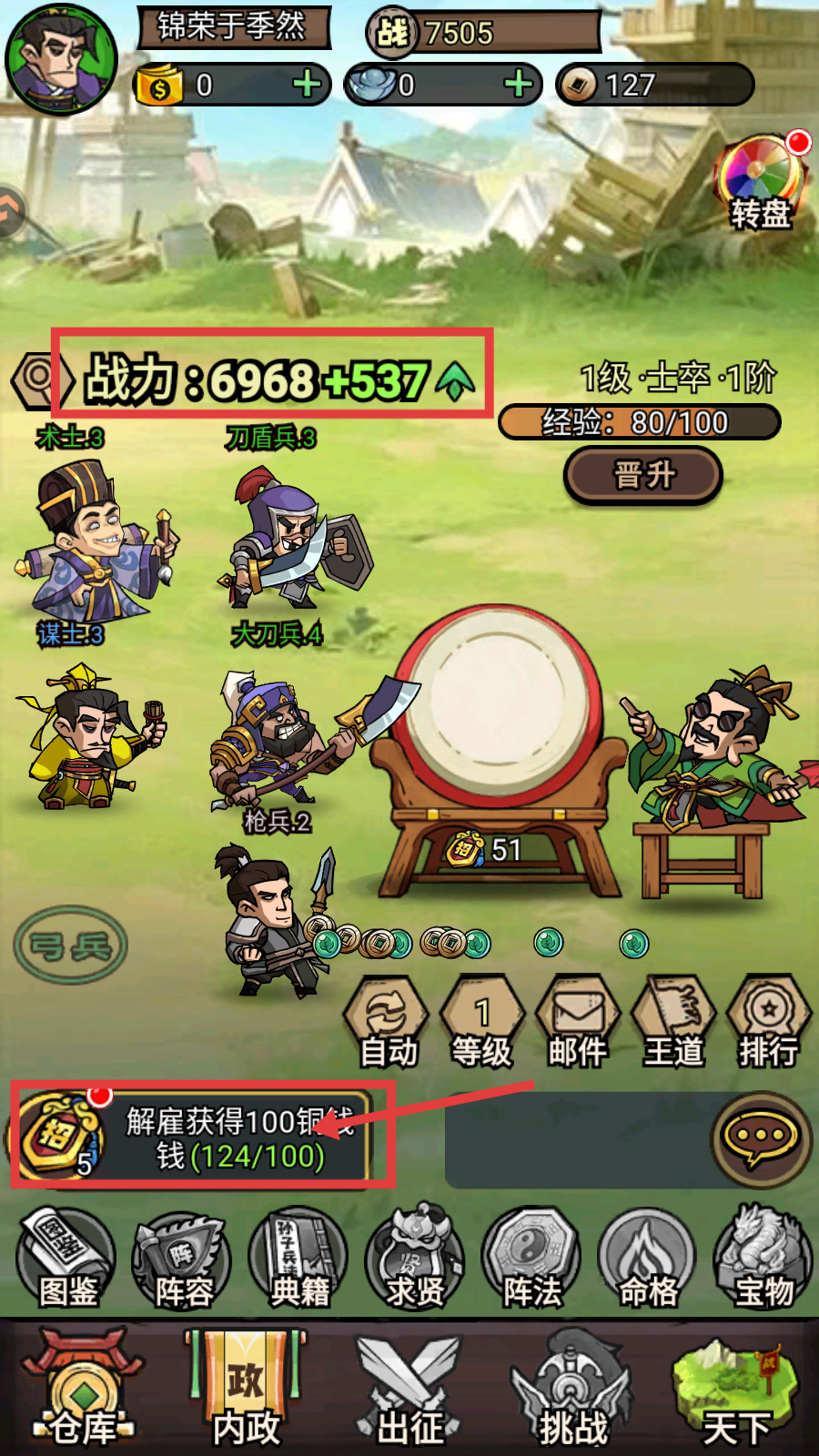 4、解雇士兵获【100铜钱】,战力升至【6968 537】,积累资源同时推进养成进度。