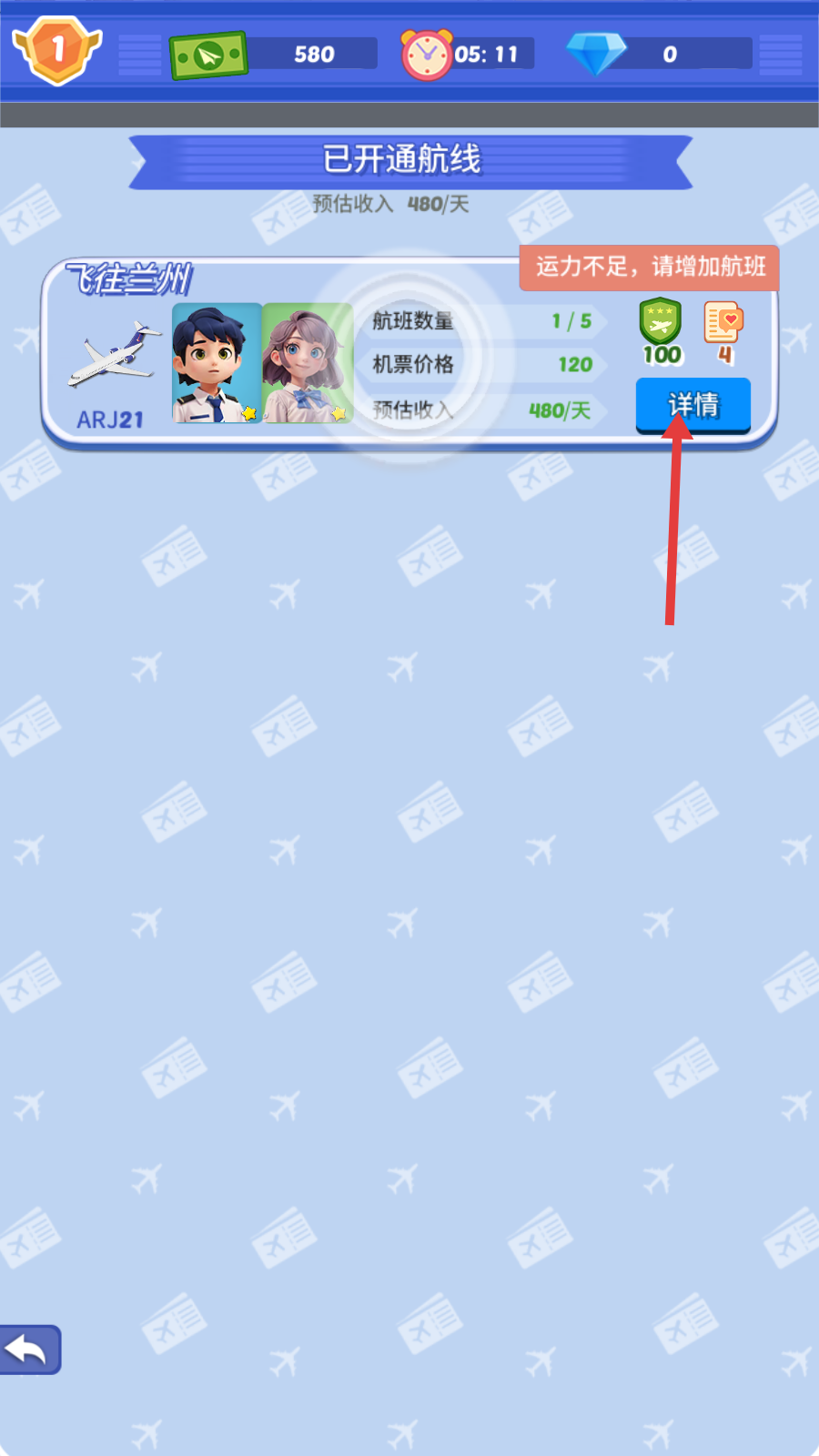 1、点击【飞往兰州-详情】,查看航班【1/5】【票价120】等信息,为调整班次做准备。