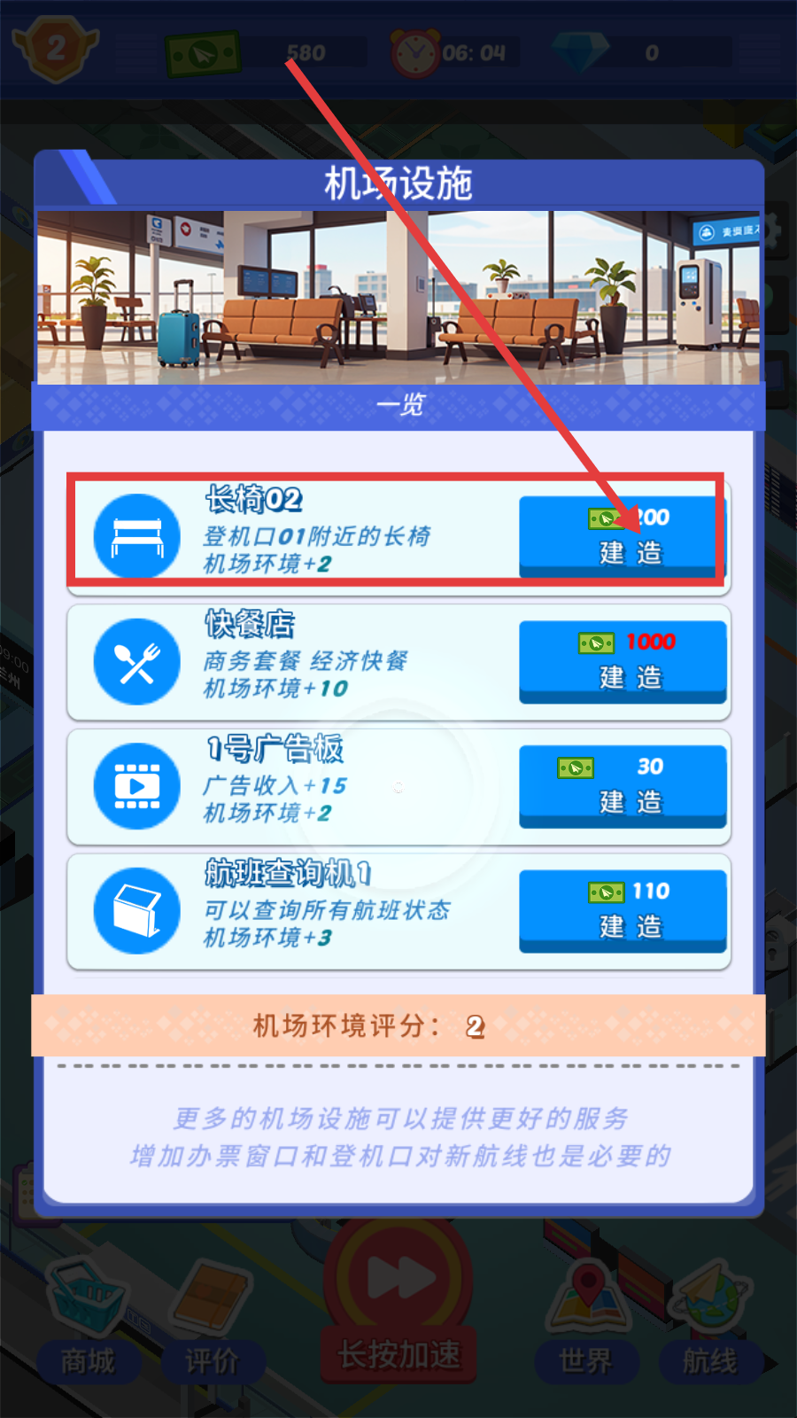 4、进入机场设施,花费100建造【长椅02】,提升环境评分,助力航司等级提升。