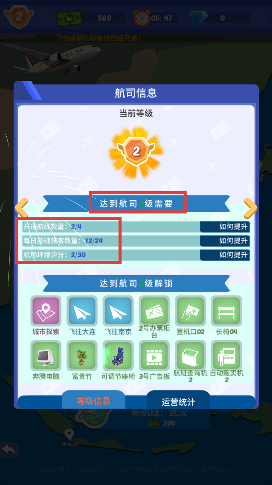 3、查看【航司信息】,明确升3级需【开通航线2/4-旅客12/24-环境2/30】,规划发展。
