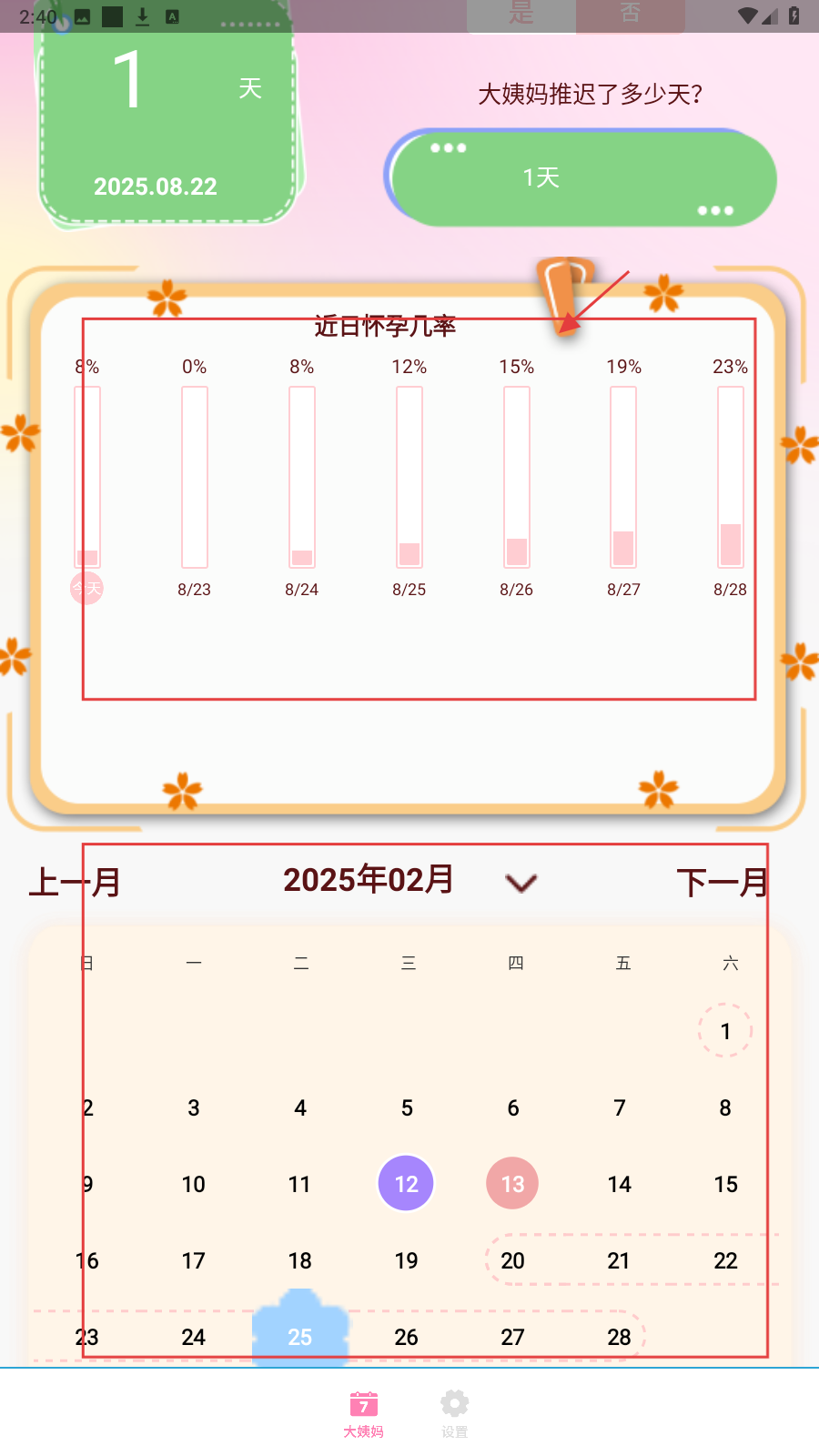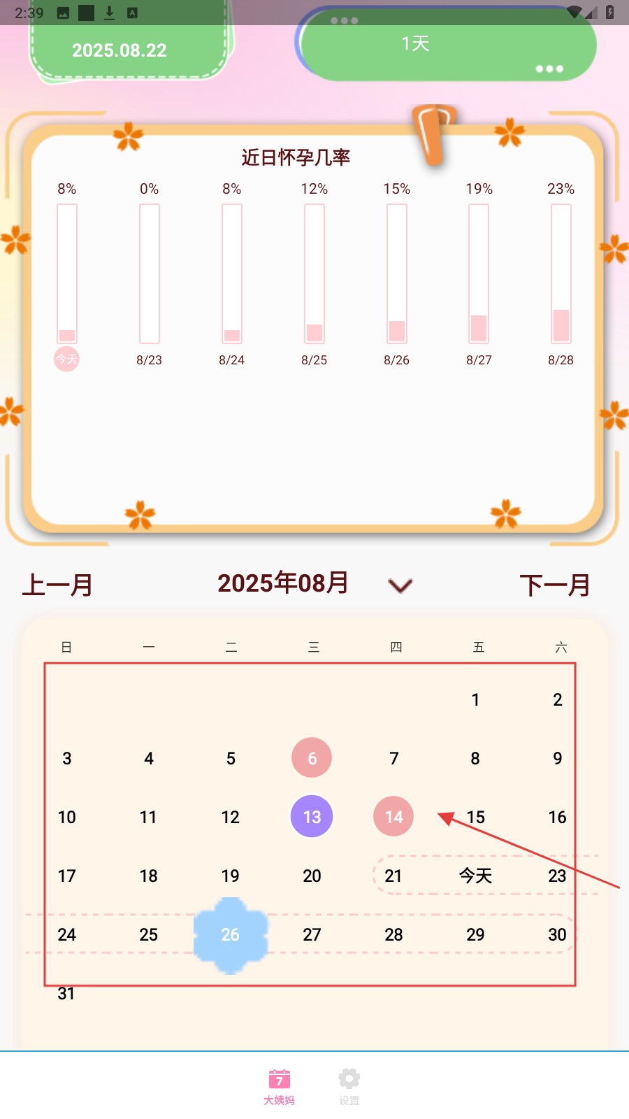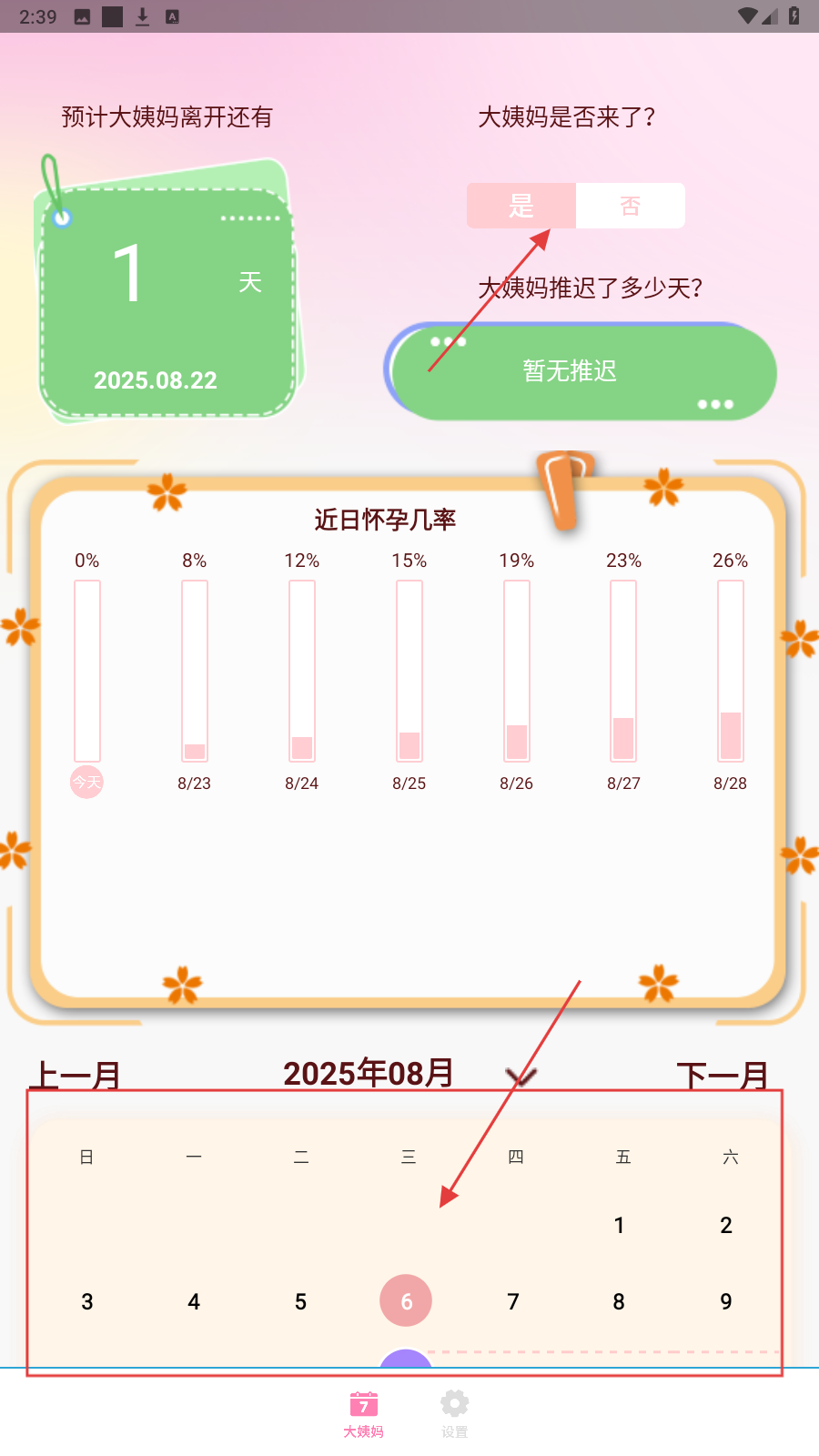 1、查看预计大姨妈离开还有天数,根据实际点【是】或【否】标记大姨妈状态,了解怀孕几率。