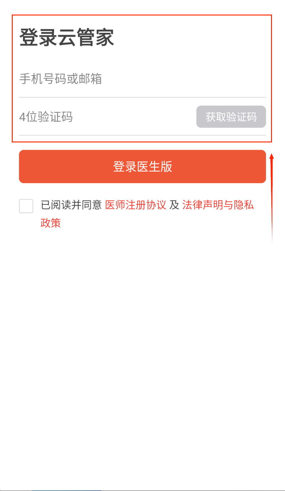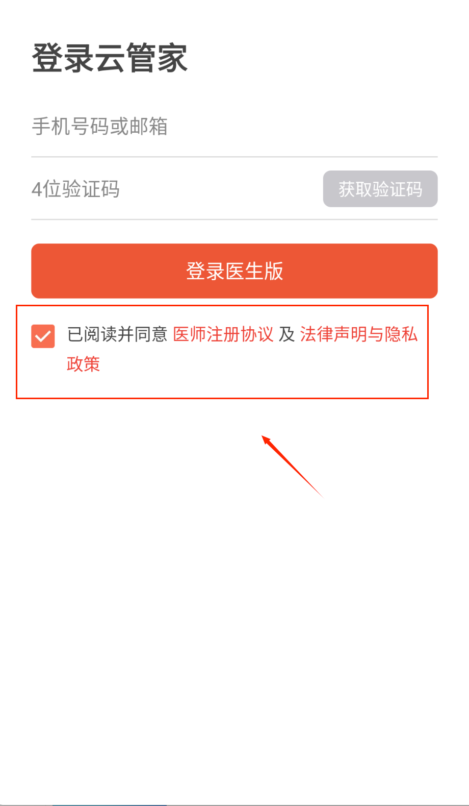 2、获取验证码后填写四位数字,别忘了勾选同意协议政策选项。这样就能顺利登录医生版了呢。
