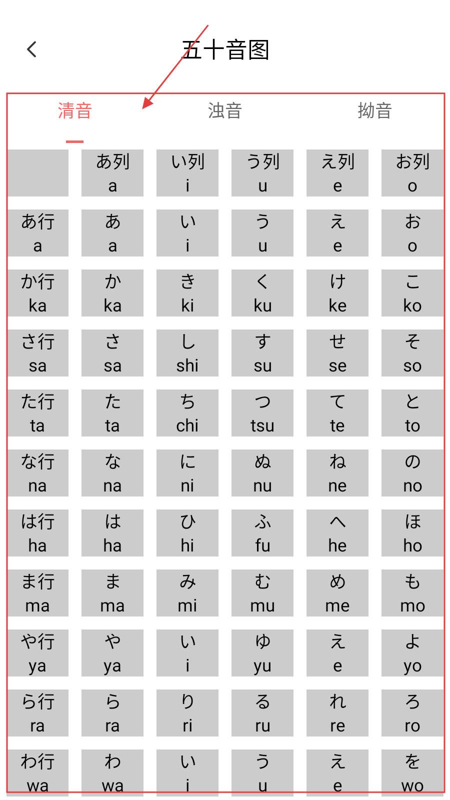 2、在【五十音图】页,先学清音部分,熟悉假名发音和写法。