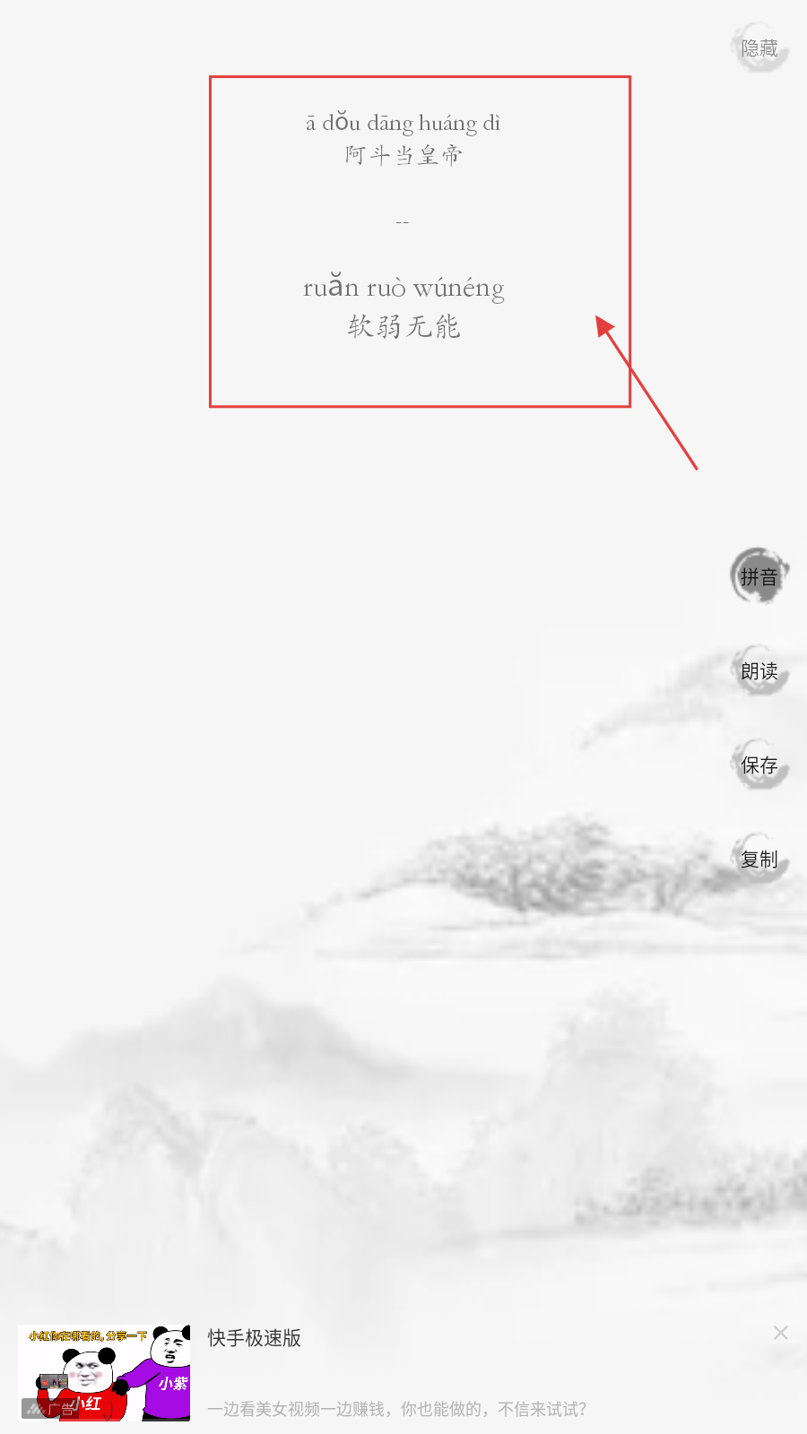 3、点【拼音】后,查看歇后语及释义的拼音,借助拼音读准内容,加深记忆。