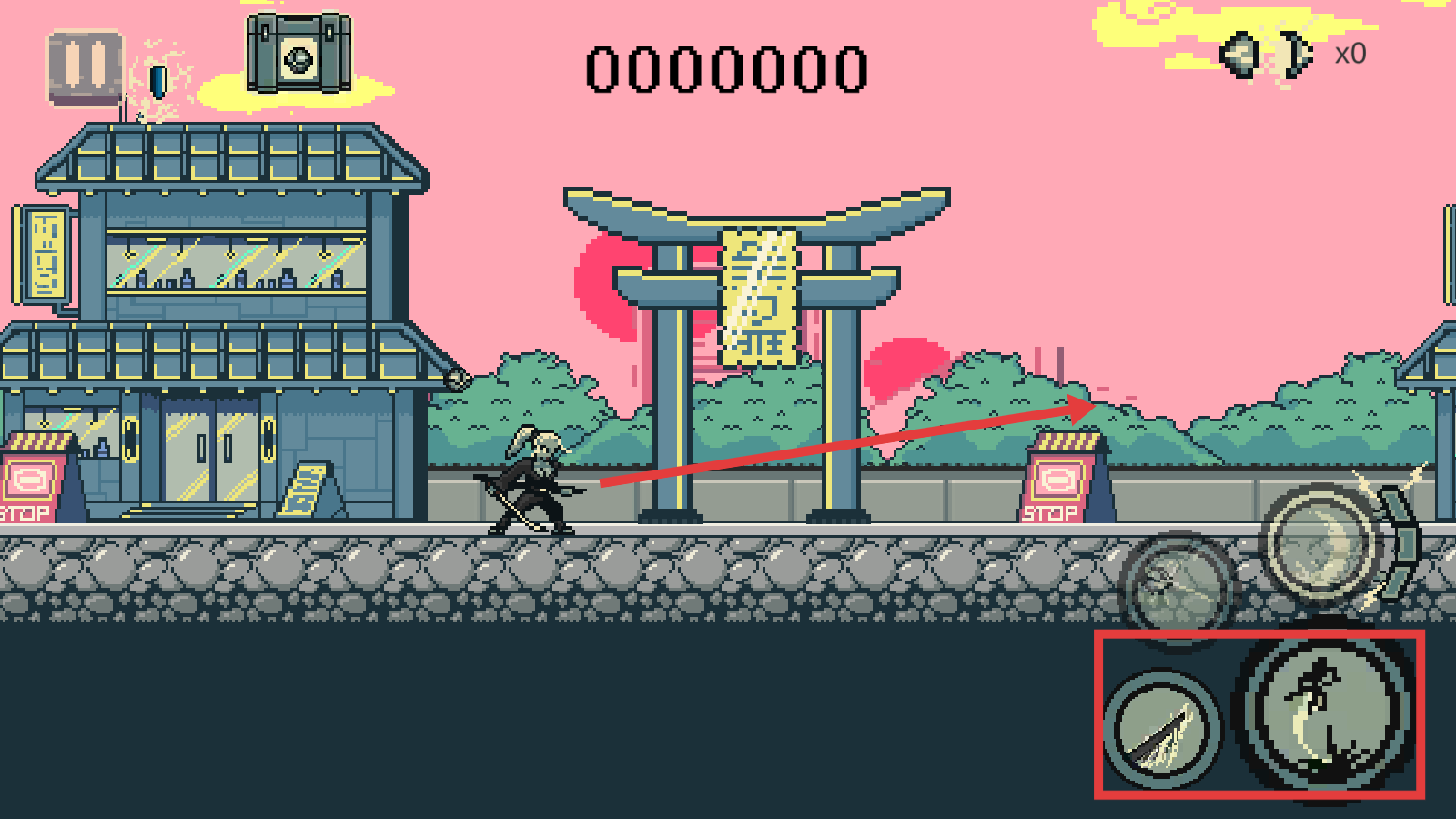 2、右侧技能键控制攻击/闪避,操控角色沿日式街道向右推进。