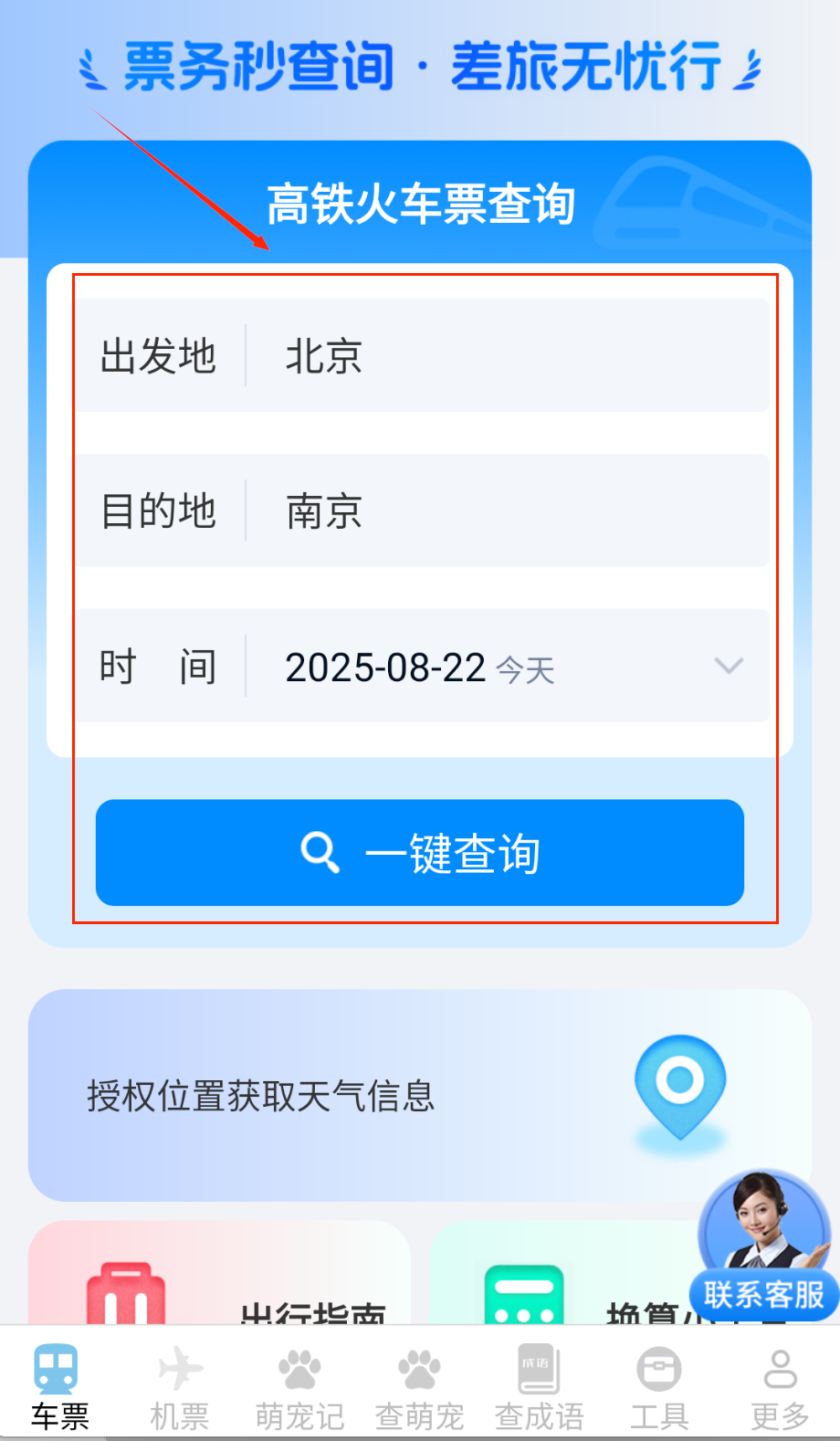 1、下载安装后首先选择查询类型,可切换火车票或机票查询模式。输入出发地、目的地和出行日期等基本信息。