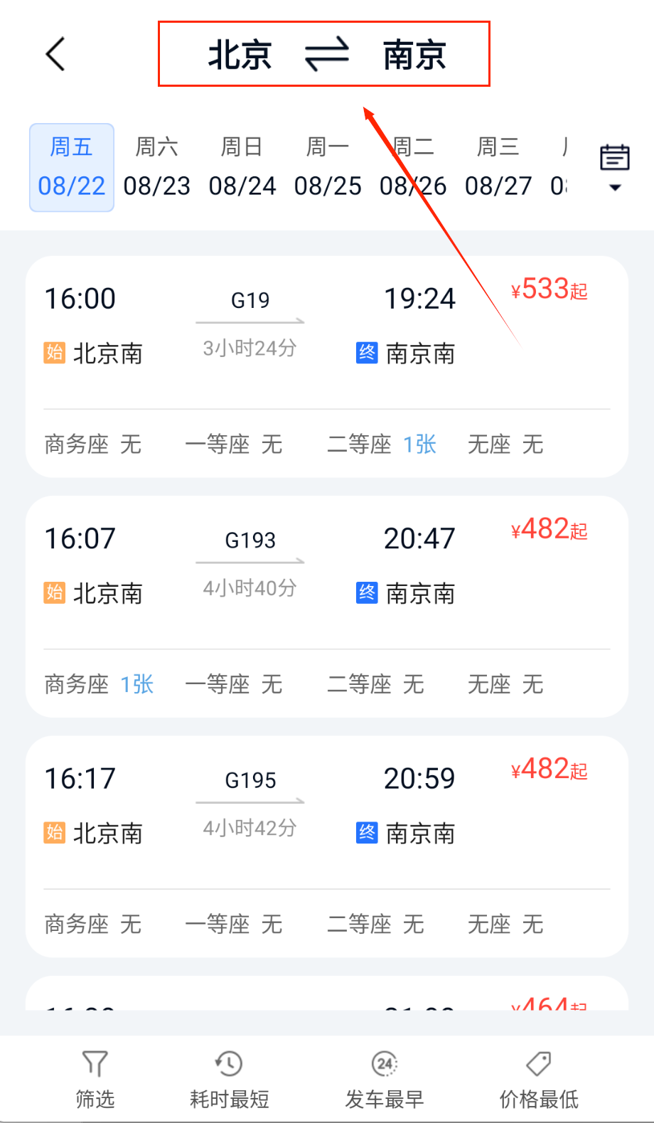 2、在查询结果页面查看不同车次或航班的详细信息,包括出发时间、票价和余票情况等。支持按价格、时间等条件筛选排序。
