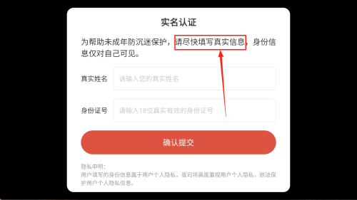 3、在“实名认证”页面输入真实姓名及18位身份证号,点击“确认提交”。