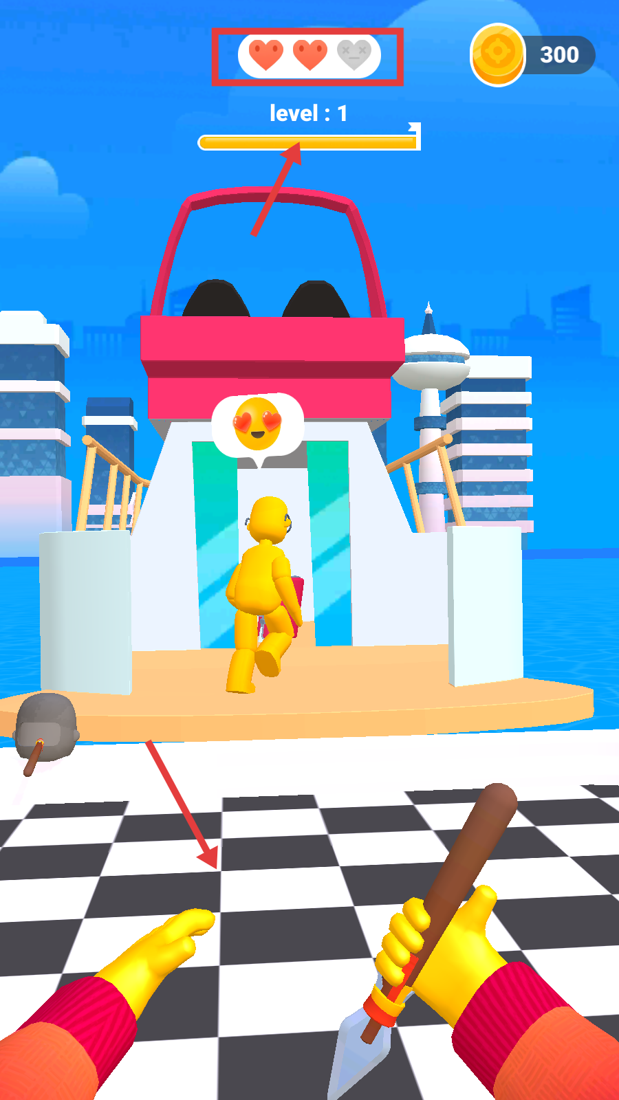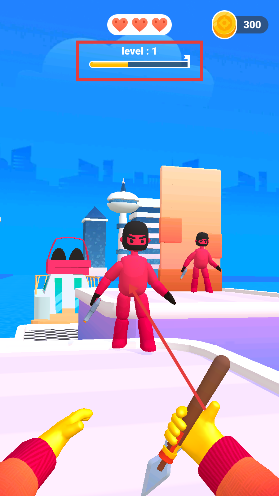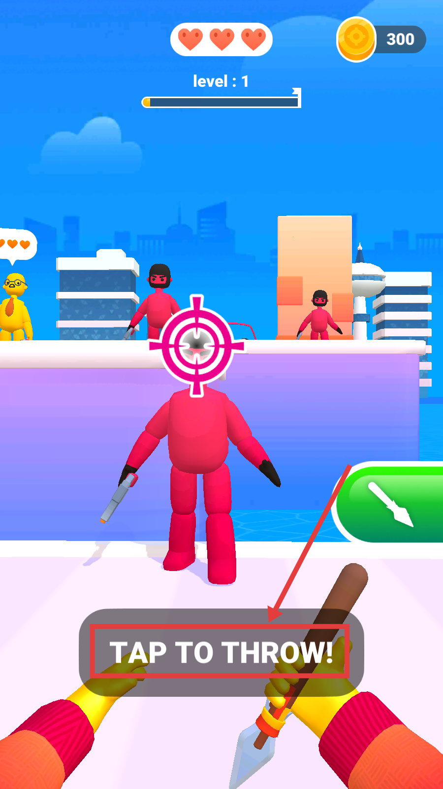1、Level1开局,点击【TAPTOTHROW】投掷武器,攻击红色敌人。