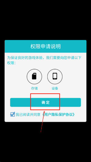 1、在游戏启动时,阅读并同意应用的权限申请,包括存储和设备信息,点击“确定”继续。