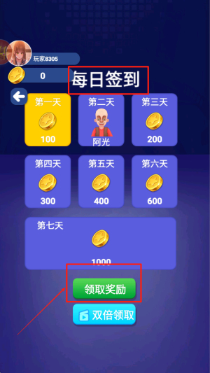 2、在游戏主界面,找到并点击“每日签到”领取每日奖励,可以选择“领取奖励”或“双倍领取”。
