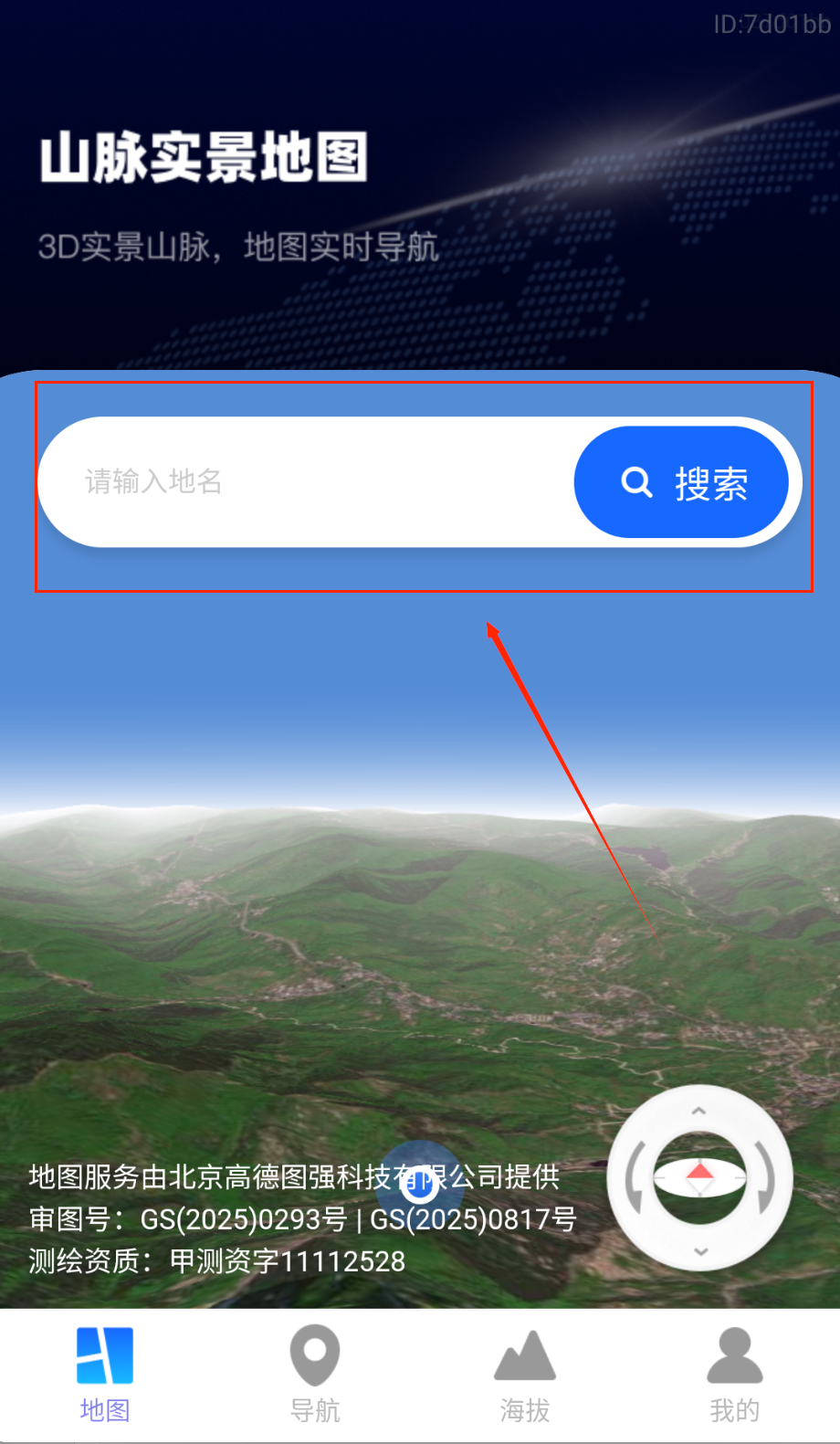 1、下载安装后首先允许定位权限,系统会自动显示当前位置和周边地形。在搜索栏输入目的地名称,查看3D实景地图和地形特征。