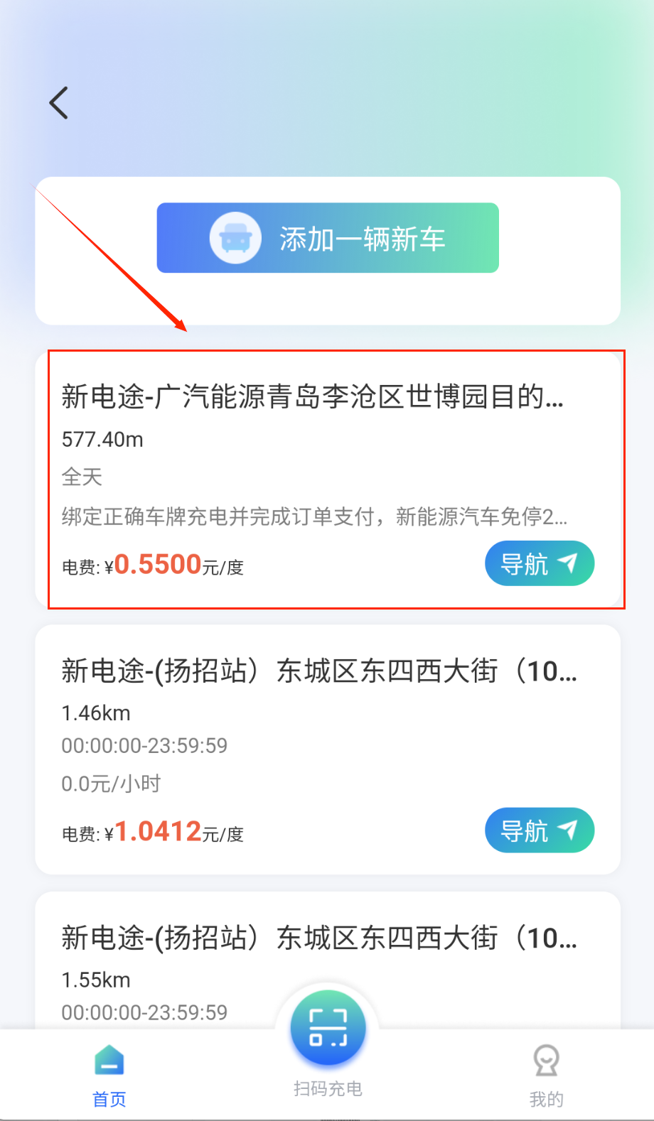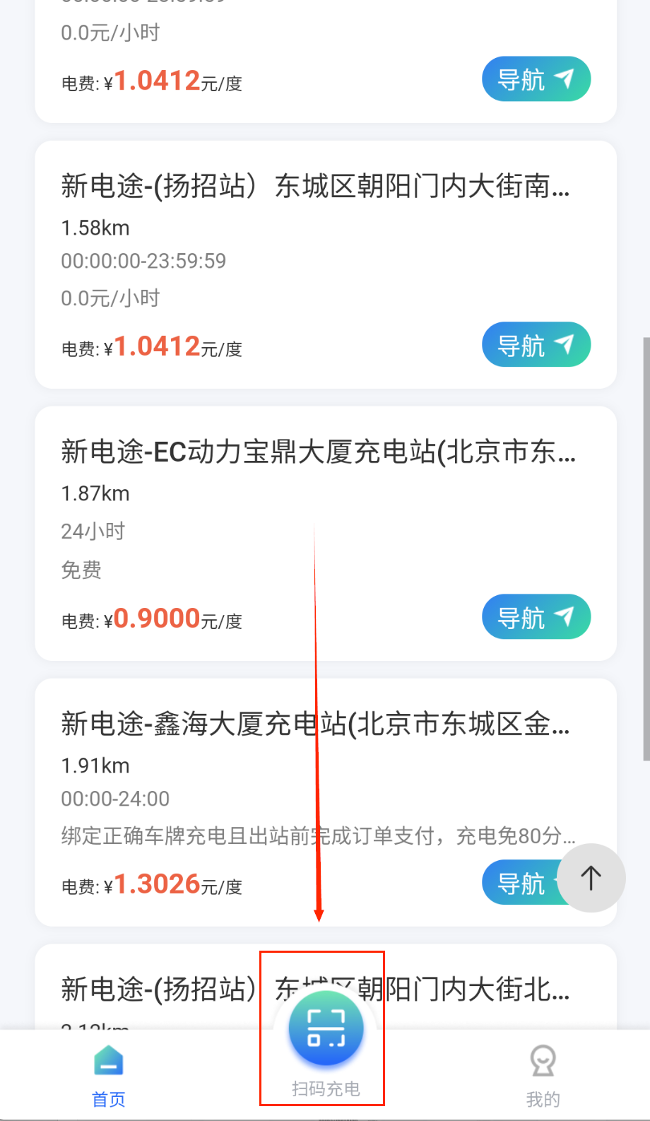 3、到达充电站后使用内置扫码功能识别桩体二维码,自动跳转至充电支付界面完成启动操作,同时可查看实时充电进度与费用明细。