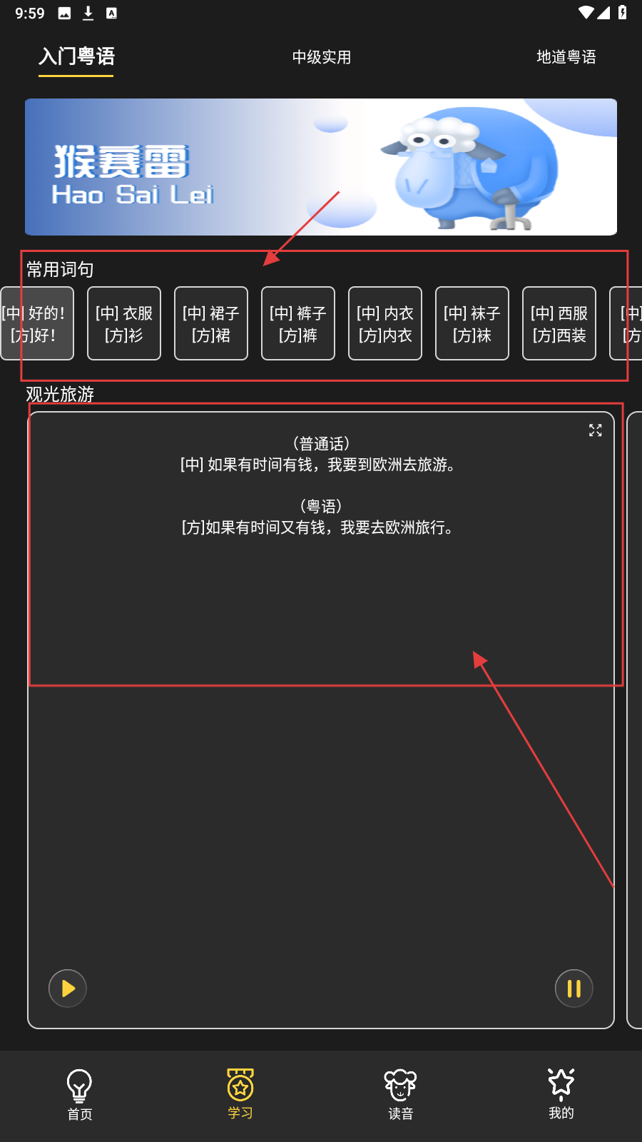 4、到【学习】页,选常用词句(衣服、裙子等),结合观光旅游等场景句,学粤语用法。