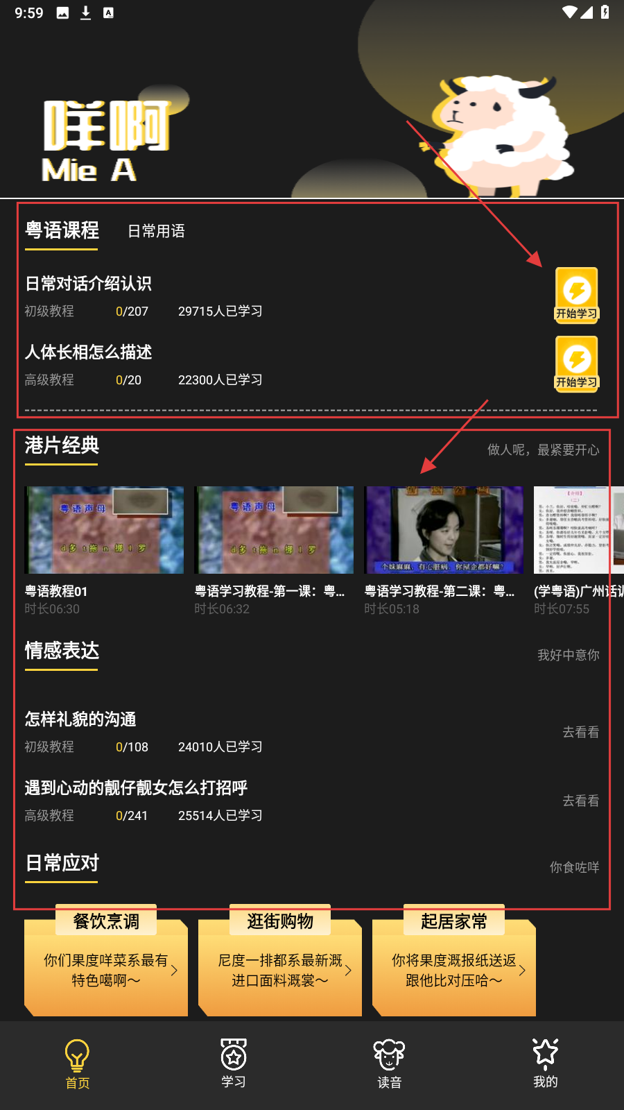 1、进入应用,选课程(如日常对话)点【开始学习】,或点港片经典视频学粤语。
