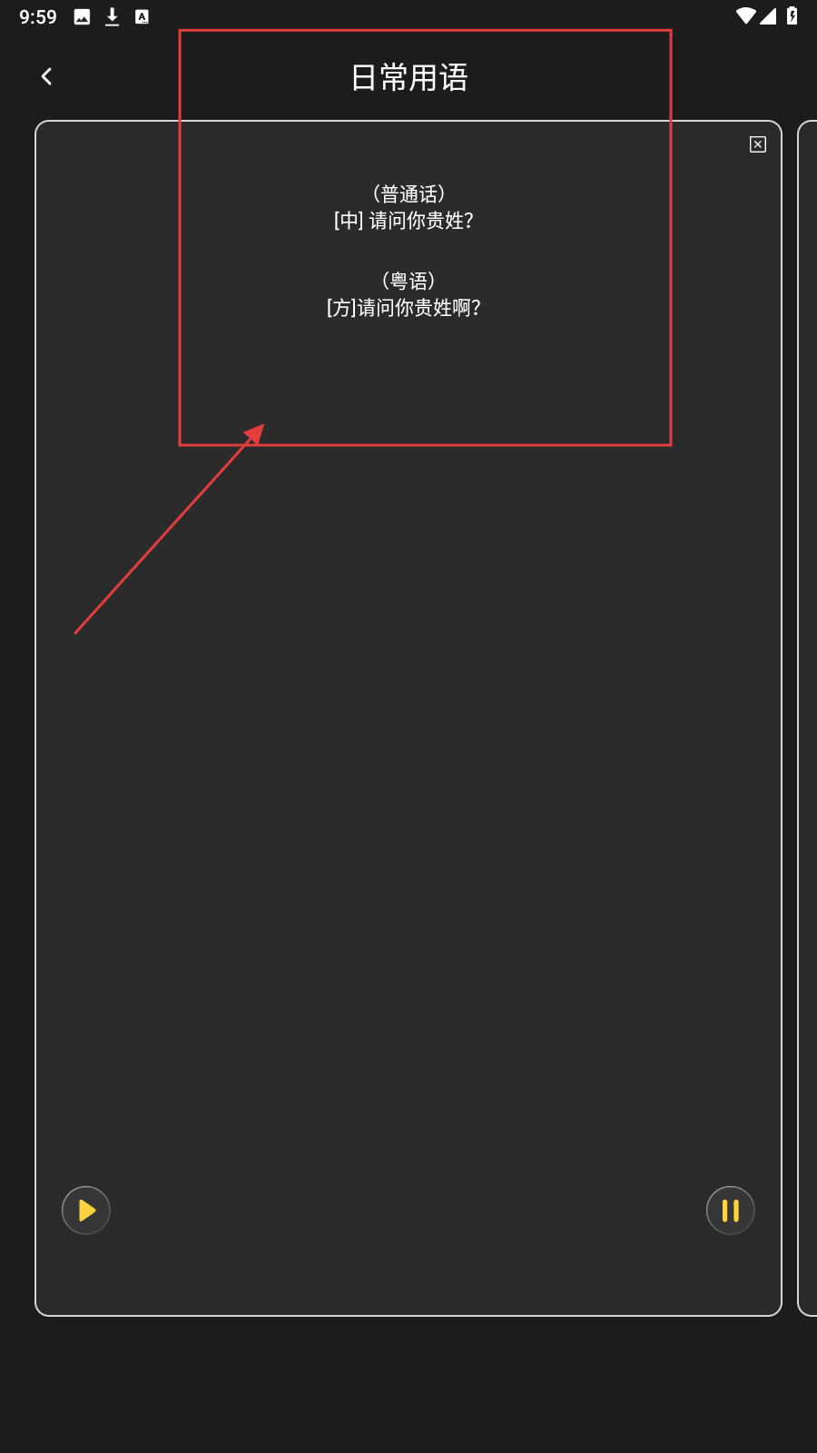 2、在【日常用语】页,看普通话与粤语对照,听音频(点播放)学发音,记粤语表达。
