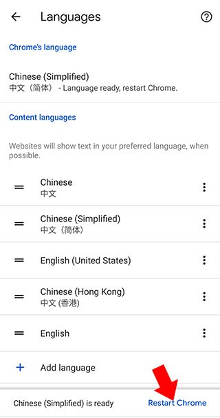 6.选择后会回到上一个界面,并且下方弹出重启Chrome的提示,点击【Restart Chrome】即可,之后重启Chrome浏览器,就可以发现浏览器已经变成中文界面了