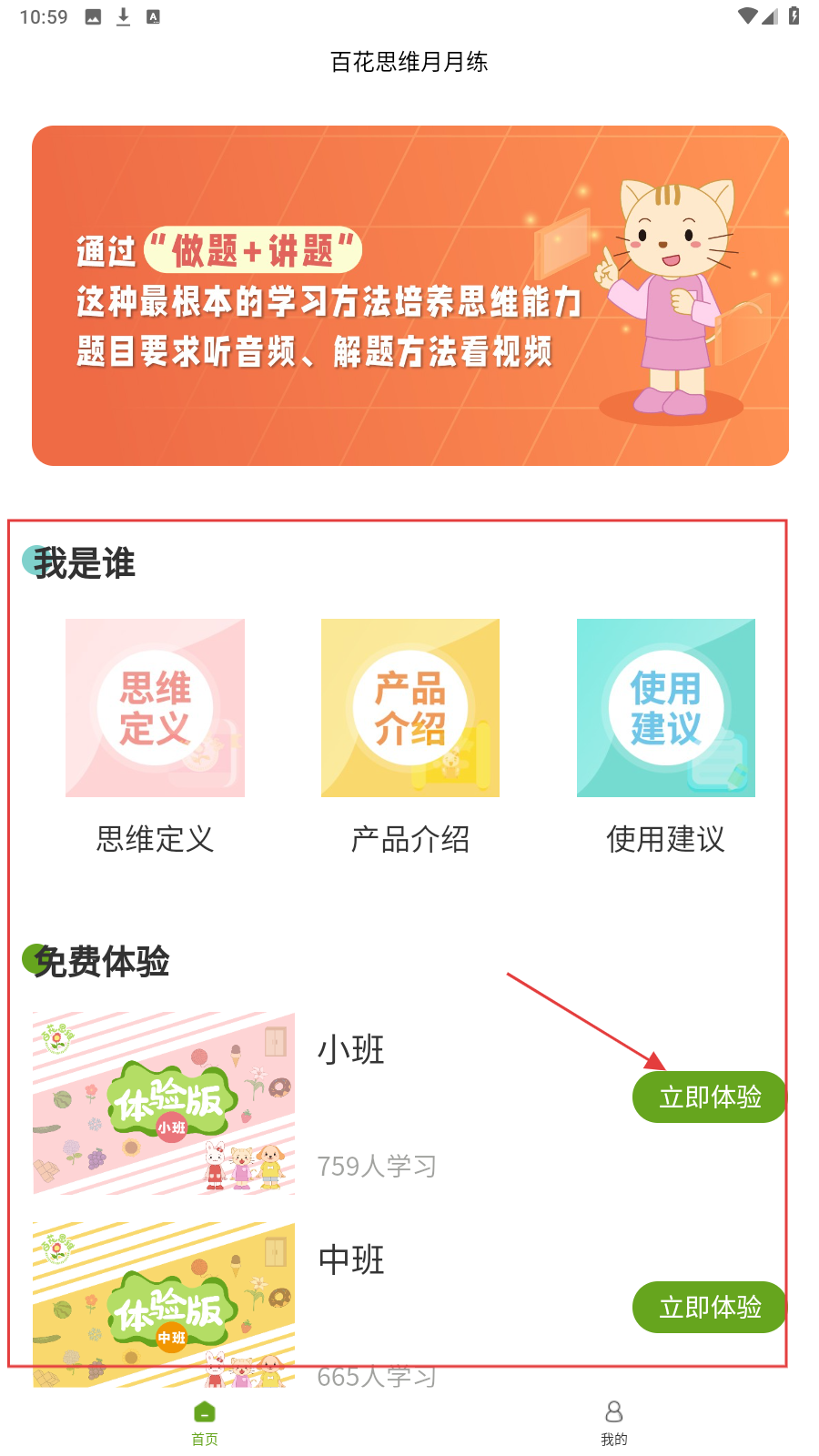 1、进入应用,选免费体验(如小班),点【立即体验】,开启思维练习。