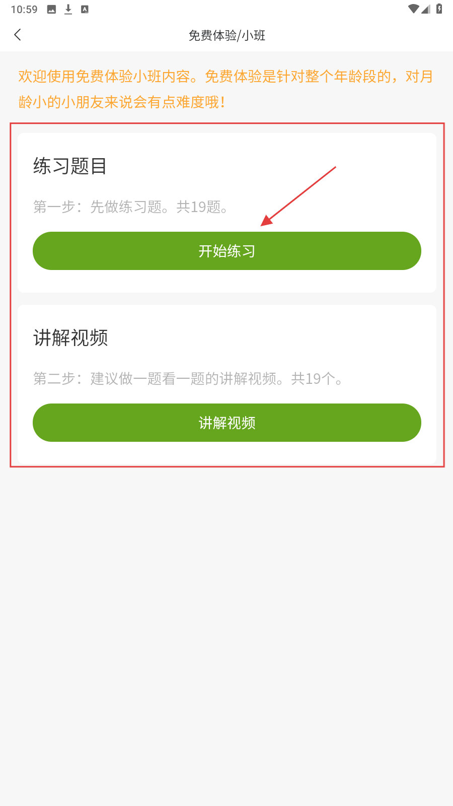 2、在免费体验小班页,先点【开始练习】做题,再用【讲解视频】学解题方法。