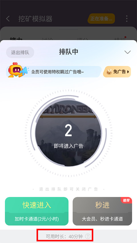 菜鸡每天都会提供免费时长的,只要观看下一小段广告就可免费领取40分钟