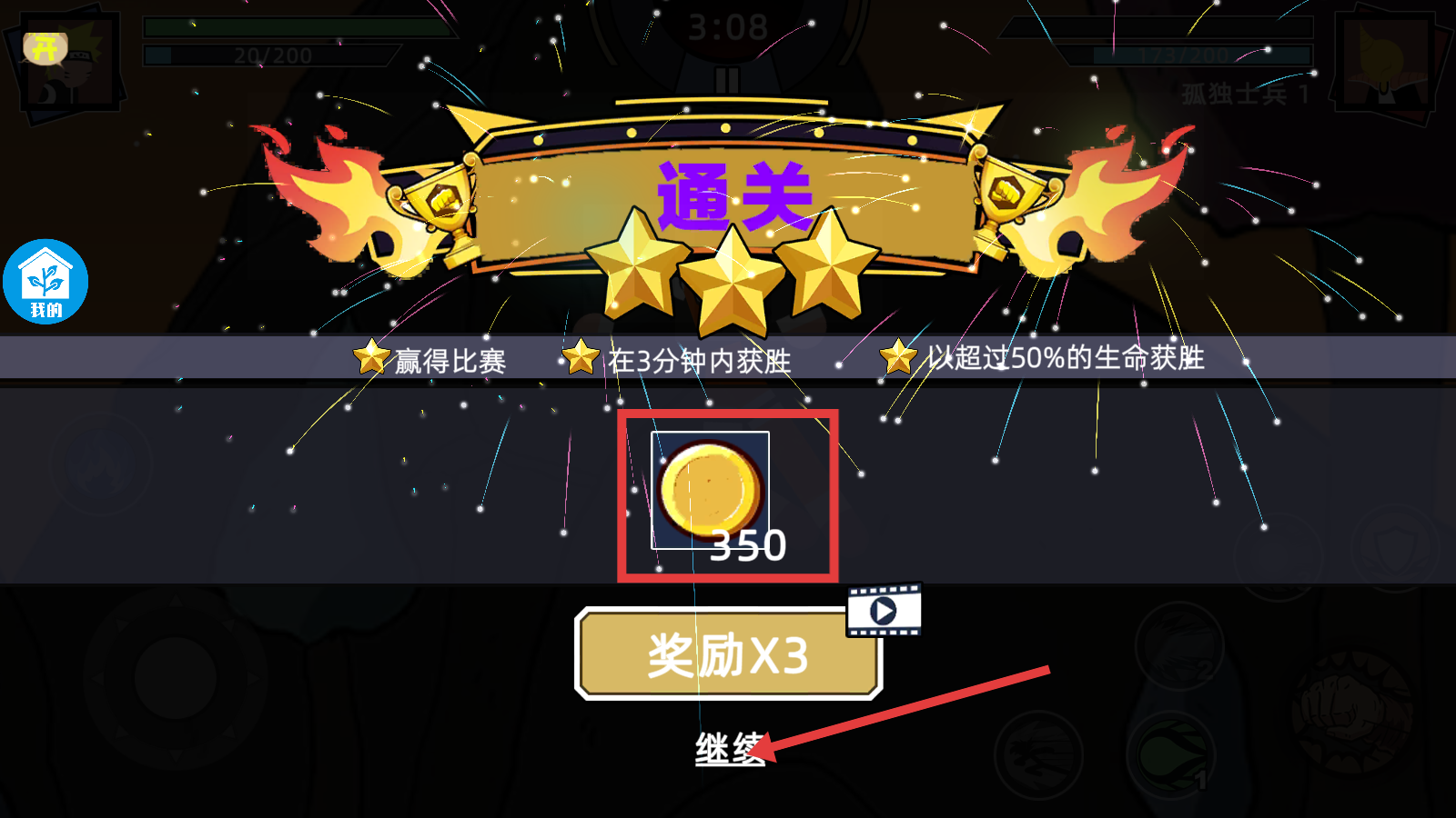 4、通关后领取【350金币】奖励,点击【继续】,挑战下一个对手。