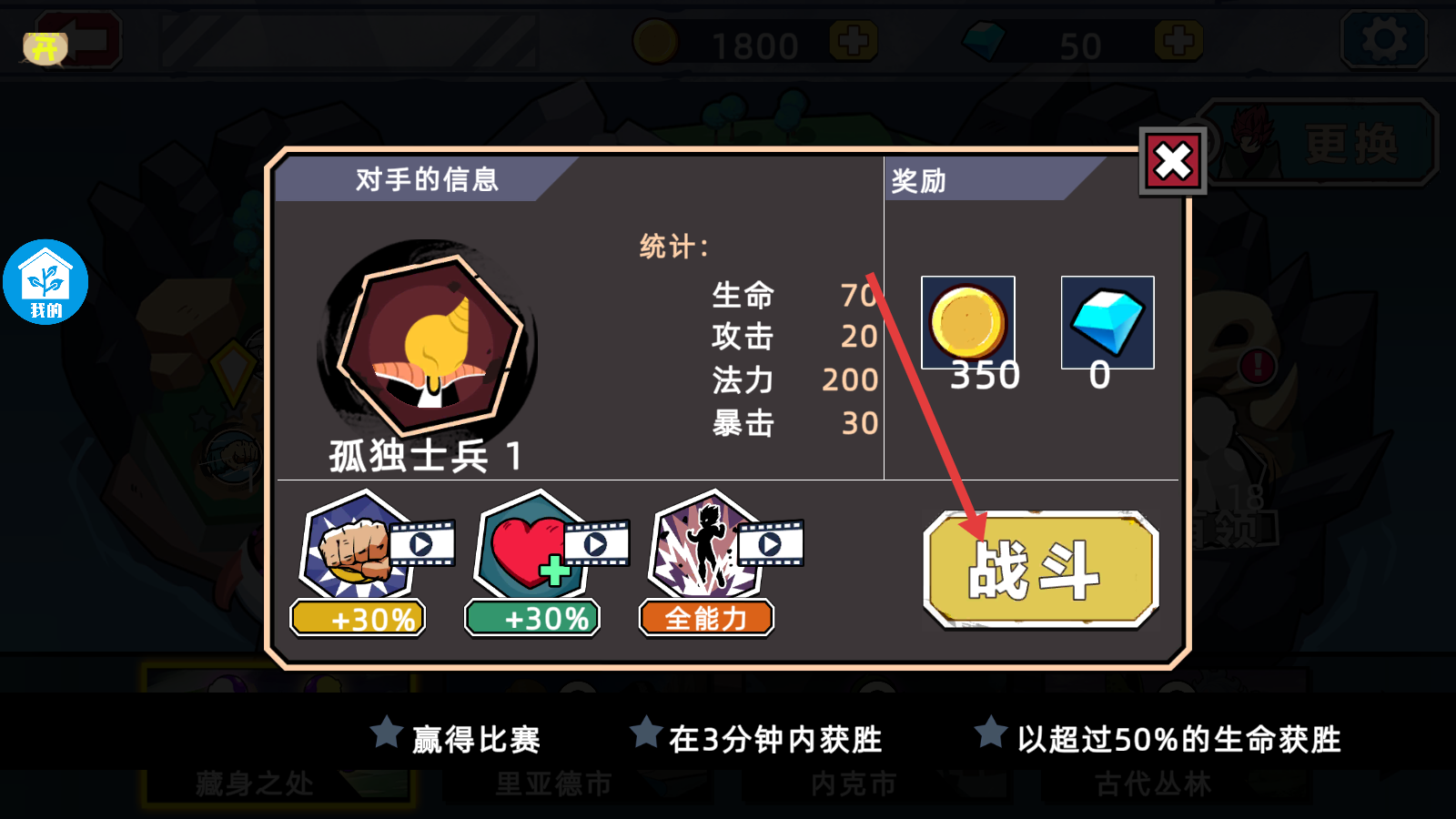 1、查看对手【孤独士兵1】属性,点击【战斗】,开启对决。