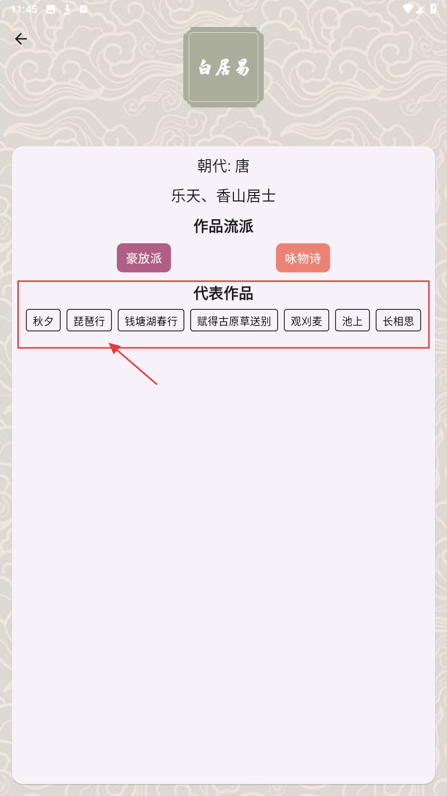 2、查看诗词大家详情,如选【白居易】,了解其唐代背景及【豪放派】【咏物诗】流派。