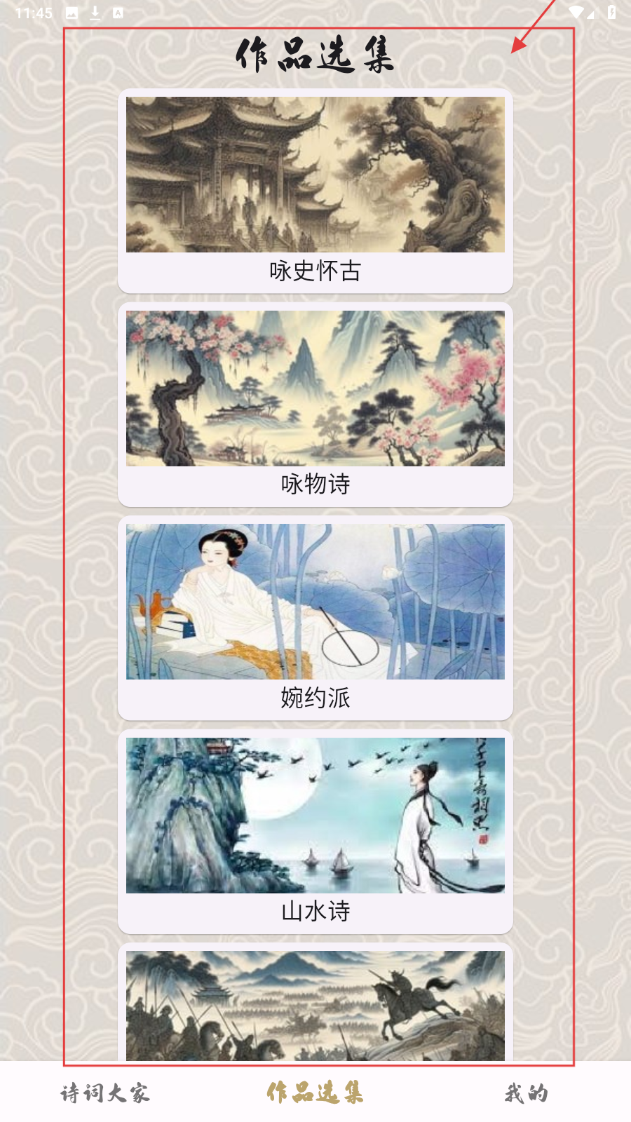4、前往【作品选集】,按需选择【咏史怀古】【咏物诗】等分类,浏览对应诗词。