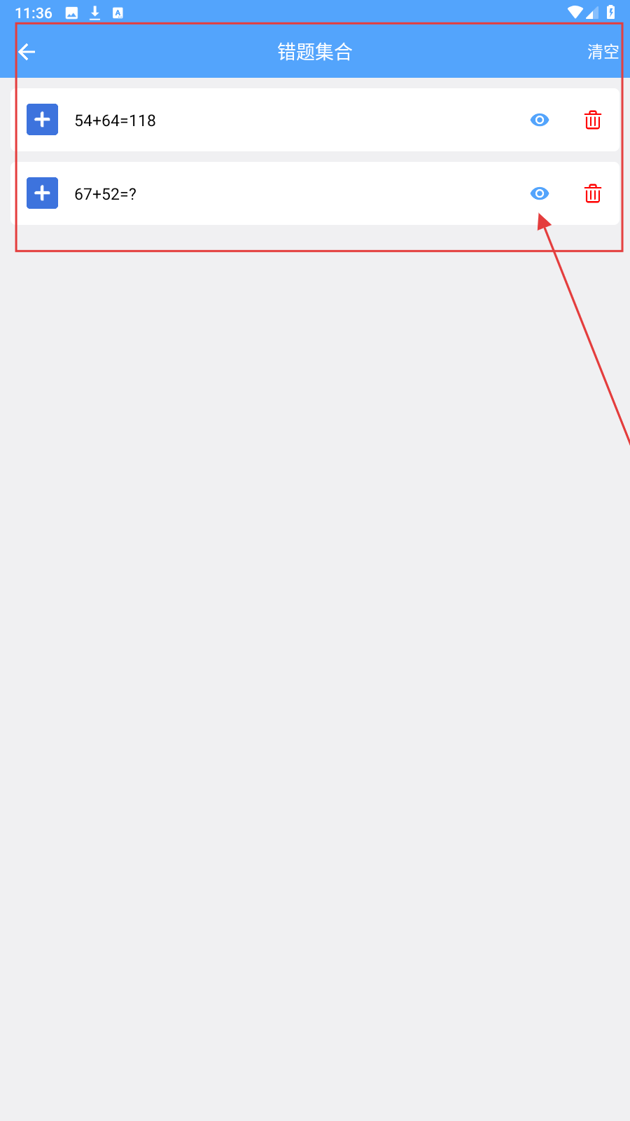 4、进入错题集合,查看错题(如【67 52=?】),点眼睛图标复习强化知识。