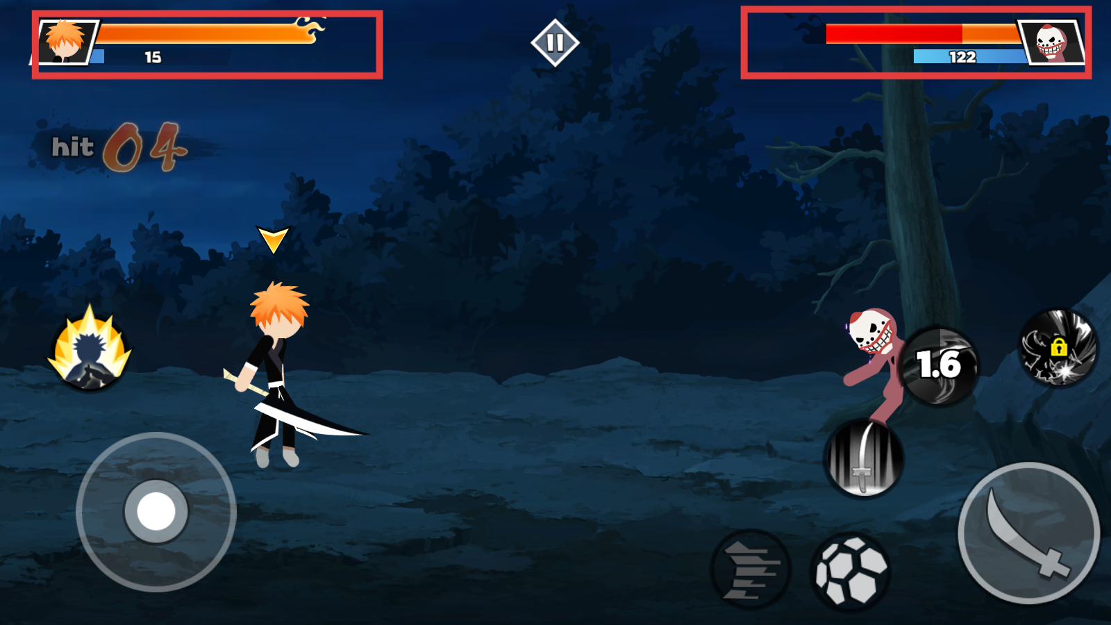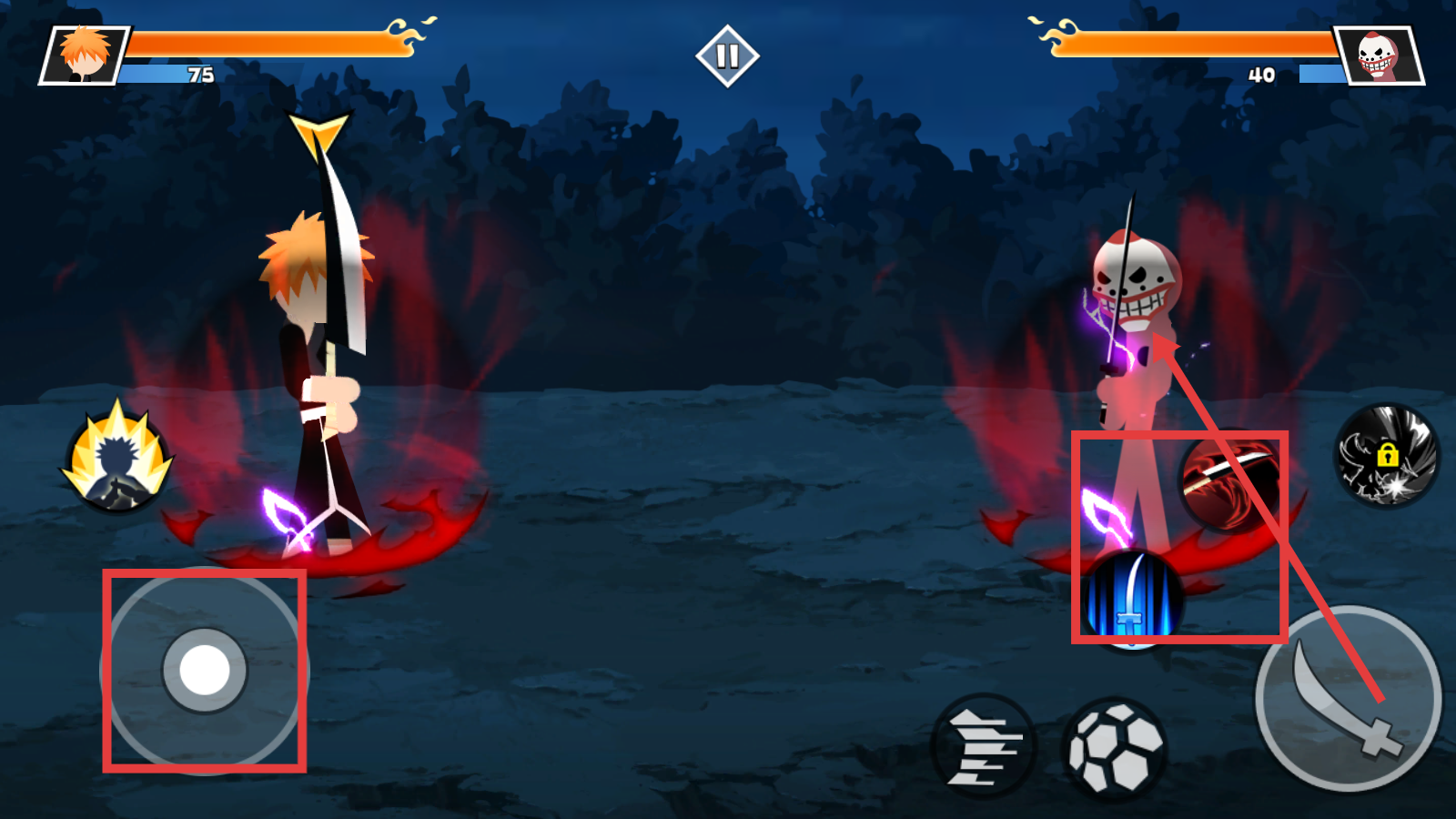 2、左侧【虚拟摇杆】控移动,右侧技能键(如斩击)攻击,紧盯双方【血条】规划攻防。