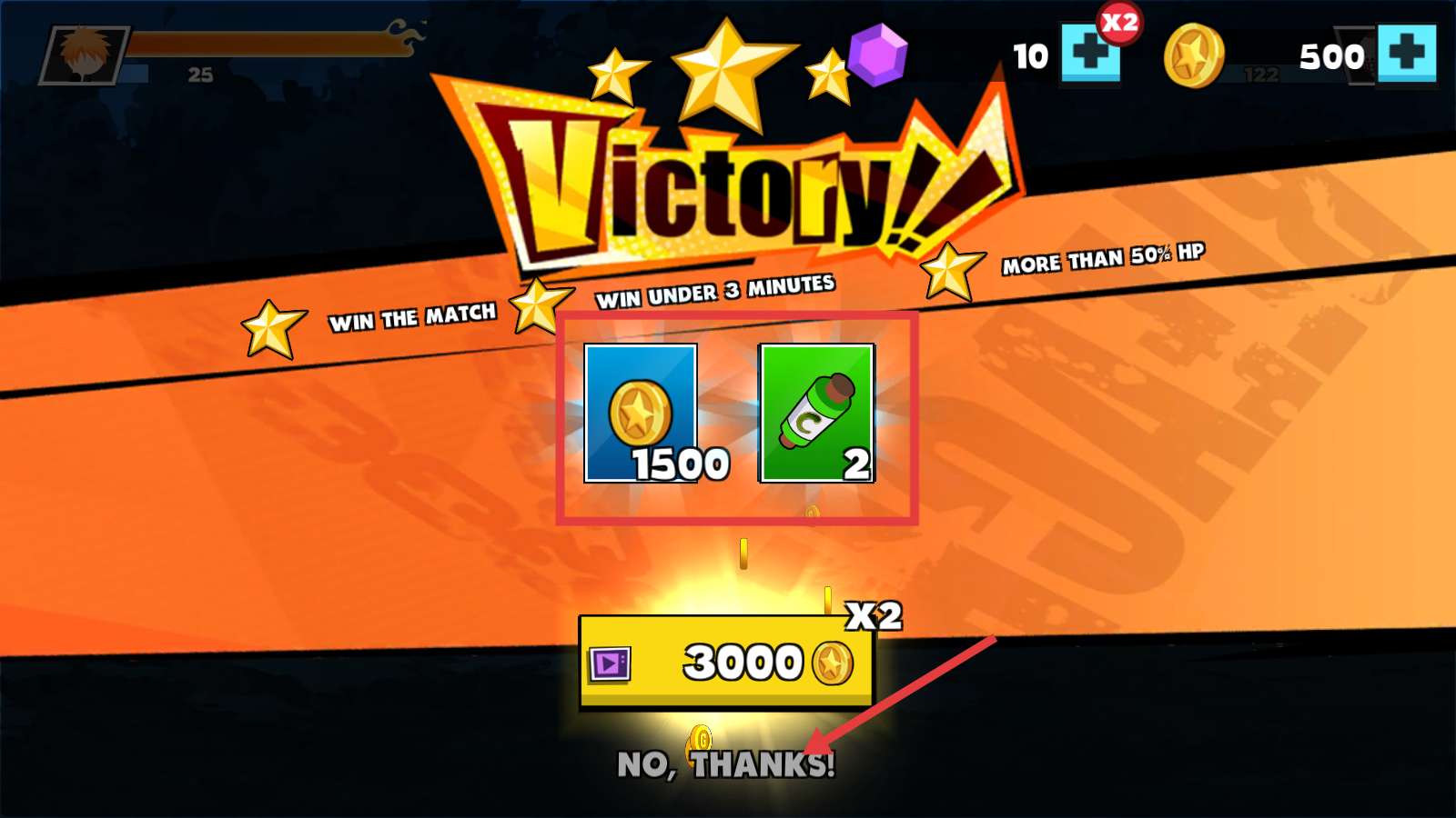 4、领取【1500金币 2瓶药水】,点【NO,THANKS!】,继续挑战。