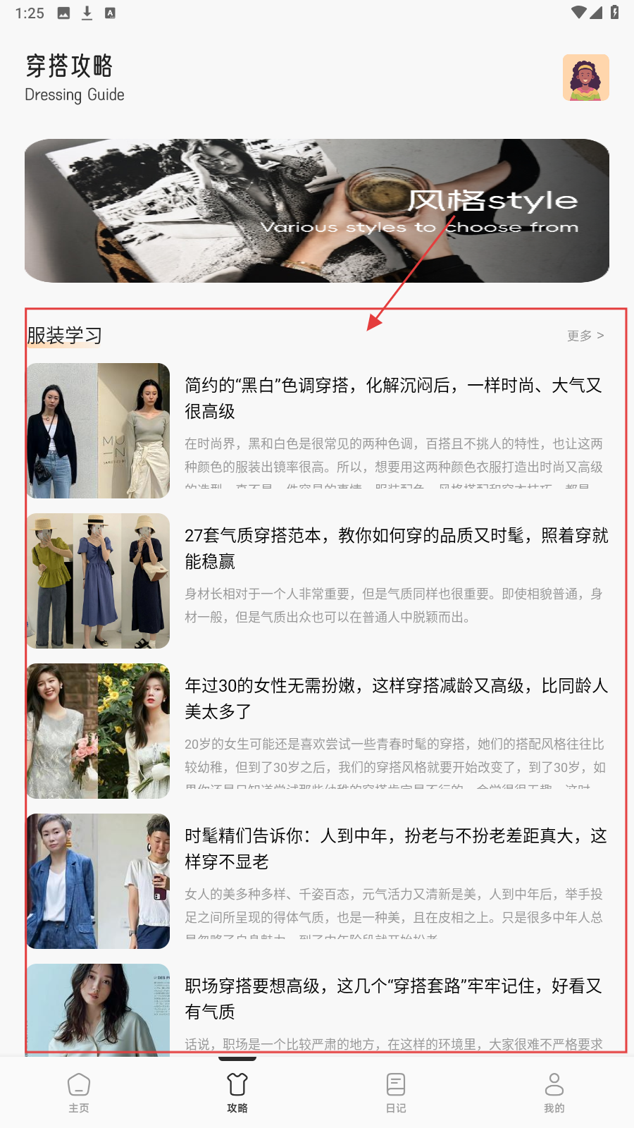 4、切换到【穿搭攻略】页,通过【服装学习】文章,系统提升穿搭审美和技巧。
