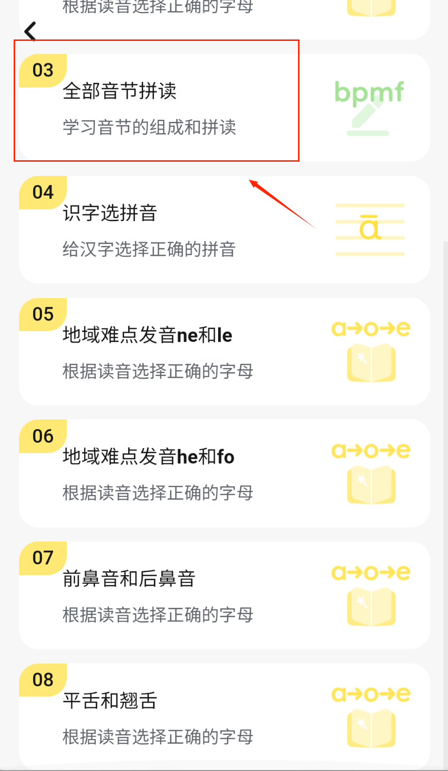 2、拼音学习系统讲解声韵母知识,配有标准发音示范。丰富的拼读练习从单音节到句子循序渐进,帮助掌握标准普通话。