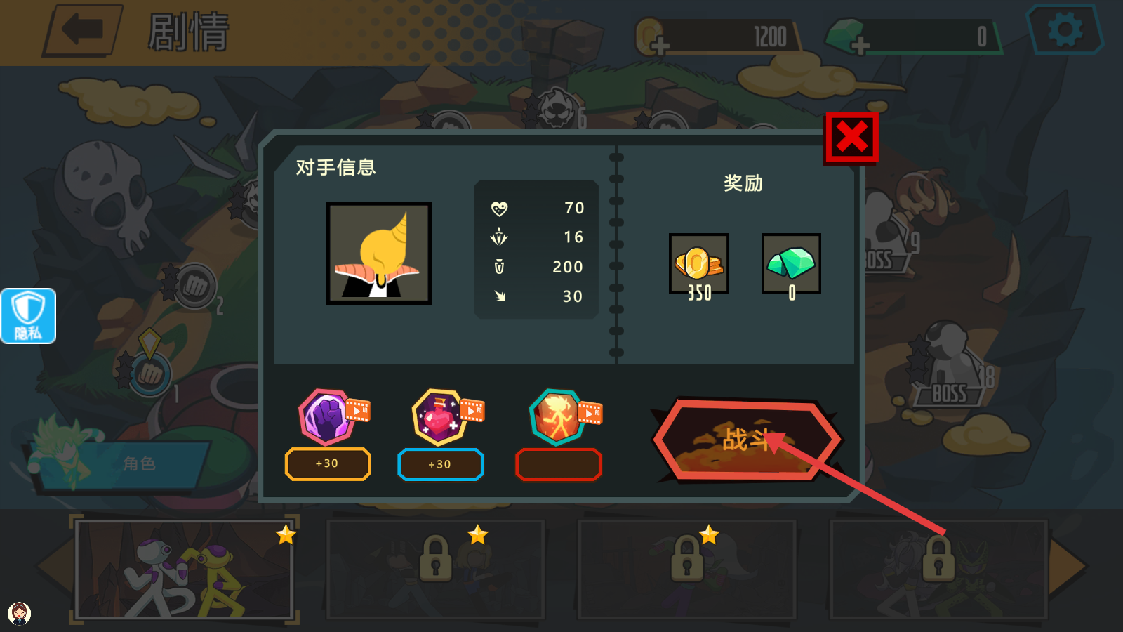 1、查看对手信息后,点击【战斗】按钮开启对决,挑战属性明确的敌人,争取获取【350-金币】奖励。
