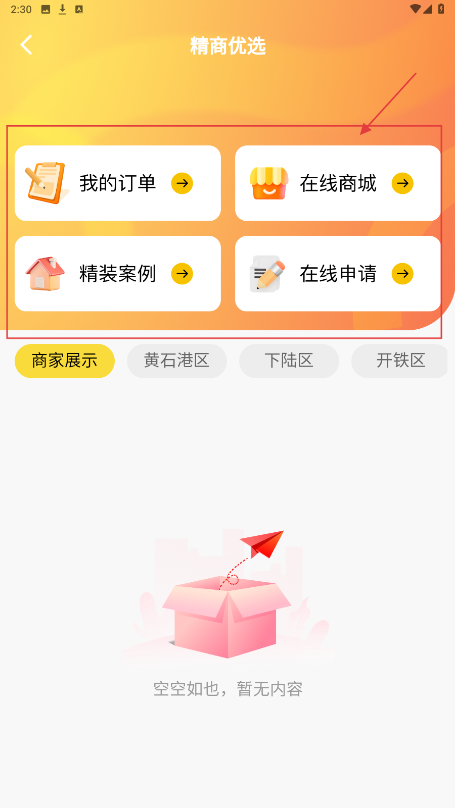 4、进入精商优选,在该页点【我的订单】【在线商城】等,管理订单或逛房产商城。