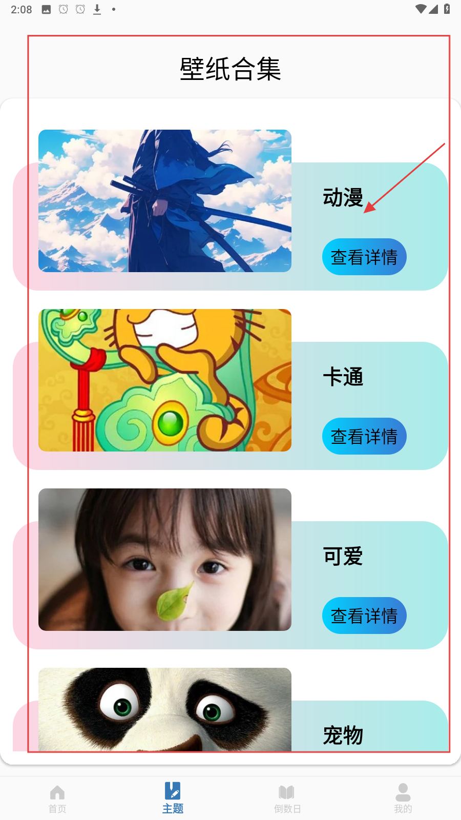3、切换到【主题】-【壁纸合集】,选喜欢分类(如【动漫】),点【查看详情】浏览。