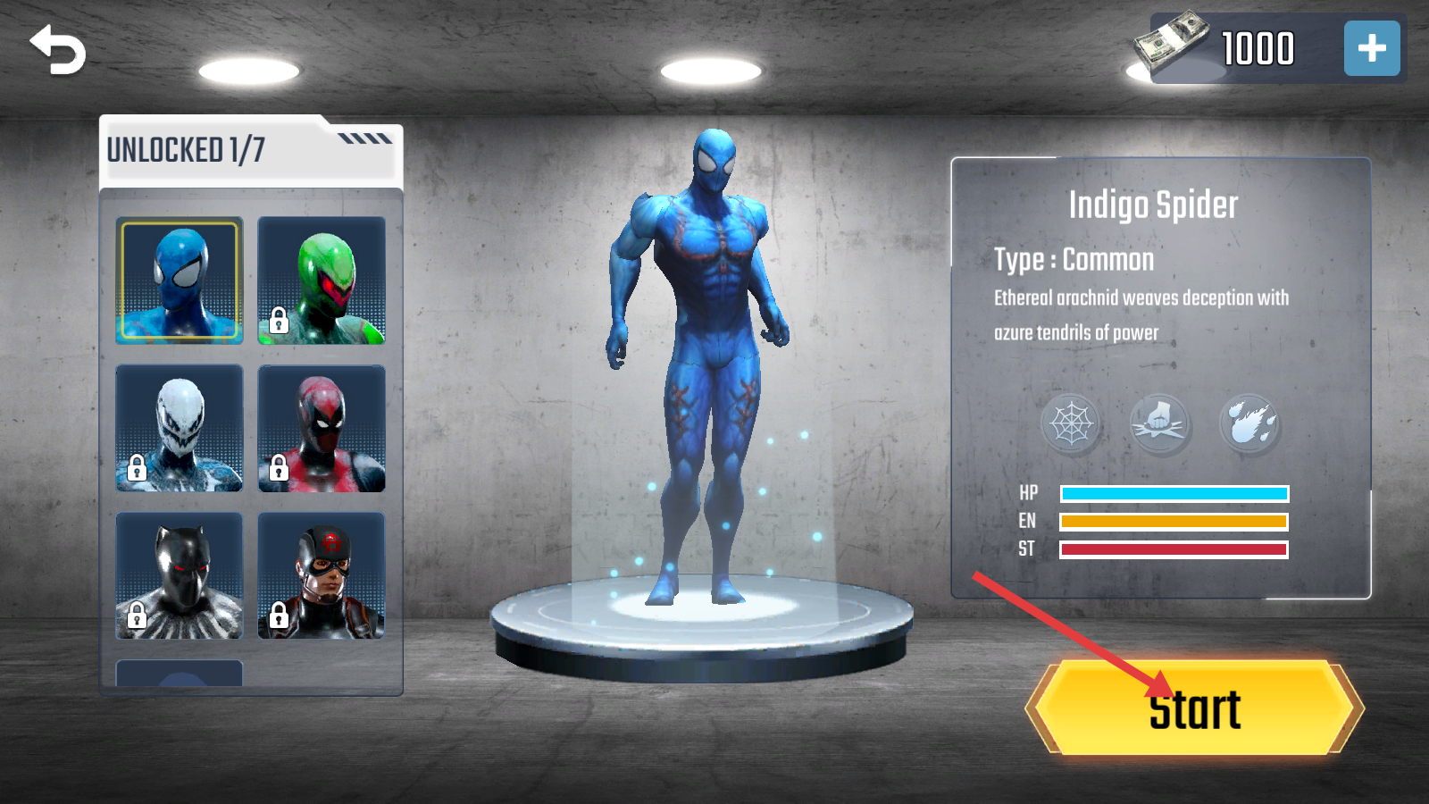 1、角色界面选择已解锁的【IndigoSpider】,点击【Start】,开启城市冒险任务。