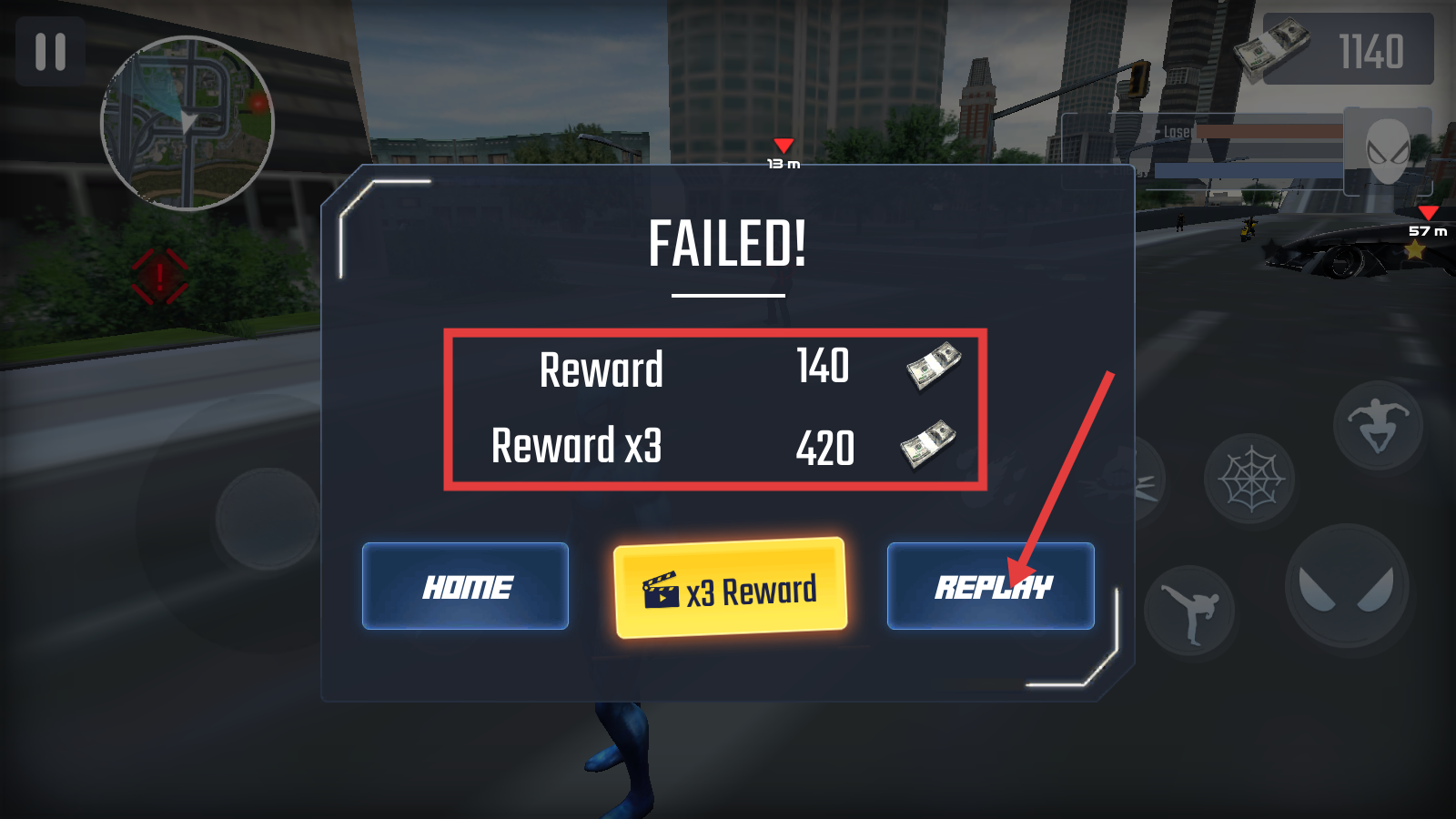 4、任务失败后,查看奖励(140/420金钱),点击【REPLAY】重启挑战,调整策略争取通关。